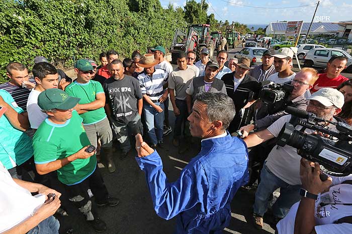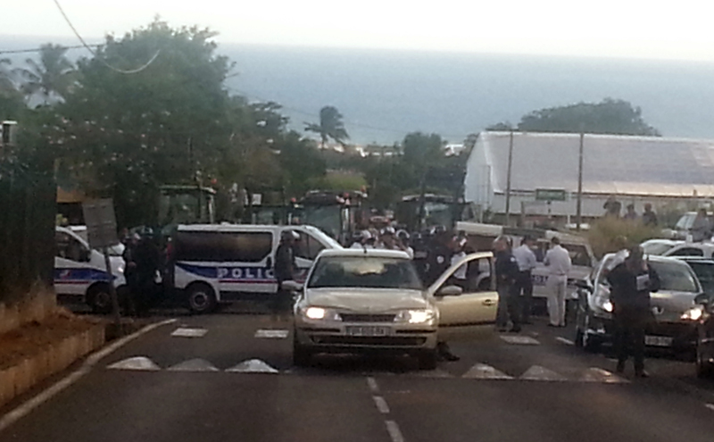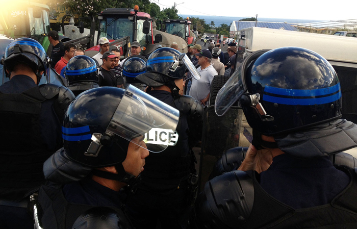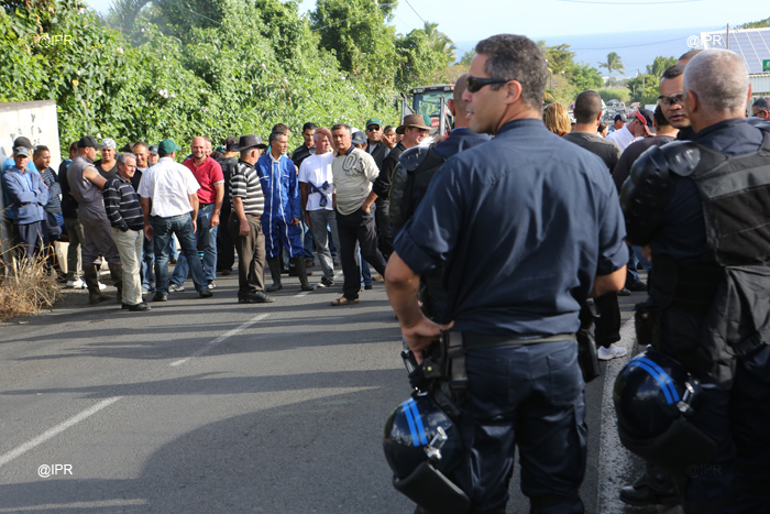 17h00 : la tension monte chez les éleveurs, qui font face aux forces de l'ordre et tentent de faire le forcing pour pénétrer dans le site de la Cilam. Avec le président de la Sicalait Patrick Hoareau, le sous-préfet Jean-Luc Lhemanne fait son possible pour ramener le calme. " Il n'est pas question de laisser se produire une confrontation entre vous et les salariés de la Cilam ! Ils sont aussi remontés que vous. Il faut trouver un terrain d'entente et ne pas aller sur celui de la confrontation ", lance-t-il, monté sur un tracteur.