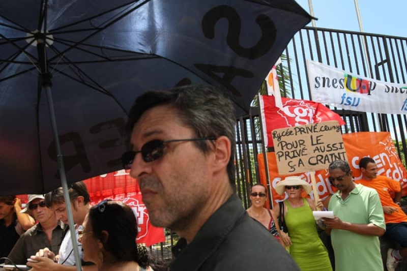 Tôt en début de matinée une trentaine de grévistes se sont rassemblés devant le rectorat. Un peu plus de 200 autres manifestants en faisaient de même devant la médiathèque. "Nous ne sommes pas très nombreux, mais notre détermination est intacte" commentait une gréviste. Les lycéens de l'UNL (union nationale des lycéens) assuraient le spectacle et l'ambiance.Le cortège prenait le départ en direction du rectorat en milieu de matinée sous un soleil de plomb. Au fil du trajet des grévistes rejoignaient la manifestation. En arrivant devant le siège de l'Académie, ils étaient environ 500 à scander "non aux suppressions de postes".