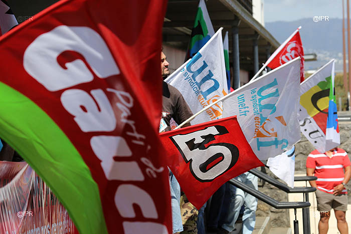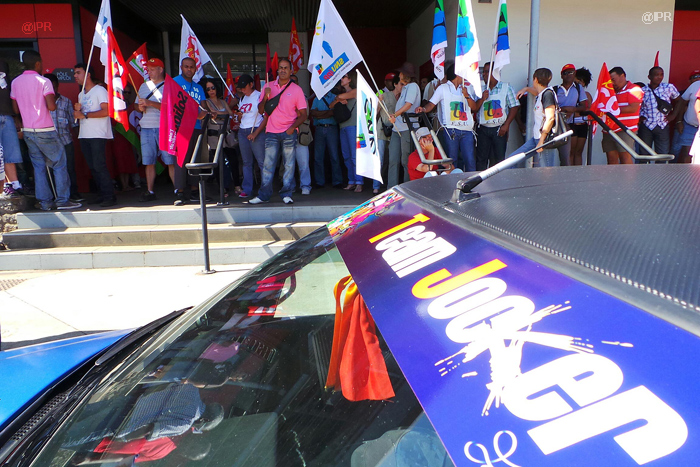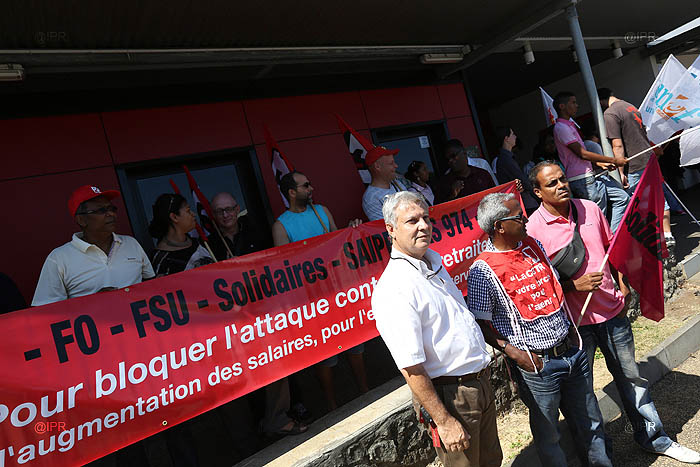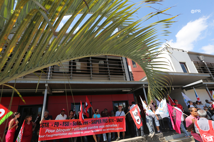 L'intersyndicale (CGTR, FO, FSU, Solidaires et UNEF) manifeste depuis 9 heures ce mardi 15 octobre 2013 devant le siège du Medef à Sainte-Marie contre la réforme des retraites. Un rassemblement "militant symbolique", selon Éric Marguerite, secrétaire général FO Réunion. "L'emploi, les salaires, les retraites : tout est lié. Le Medef représente tout cela", affirme-t-il. L'intersyndicale dénonce un projet de "régression sociale".