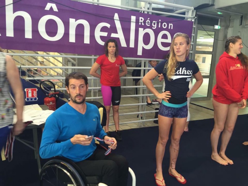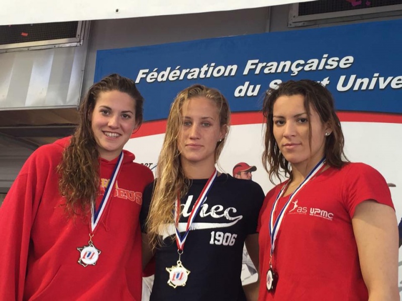 Alizée Morel a battu le record de France universitaire en 200 mètres nage libre ce jeudi 9 avril 2015 au cours des championnats de France qui ont lieu à Grenoble. C'est avec un temps de 2'02"26 qu'elle décroche la médaille d'or de la spécialité (Alizée Morel au centre de la photo).