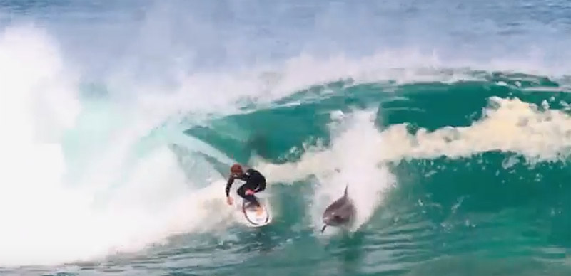 Un dauphin à l'esprit de compétition s'est invité à une session de surf sur la péninsule de Yorke en Australie il a quelques jours et la vidéo a été publiée par plusieurs médias au cours du week-end du 26 et 27 mars 2016. "Alors que le surfeur australien de 20 ans Soli Bailey se paye un joli tube, il voit surgir à ce même instant un dauphin qui "perce" la vague quelques mètres devant lui" écrit meltyxtrem.fr (capture d'écran de la vidéo de Matt Lewis)