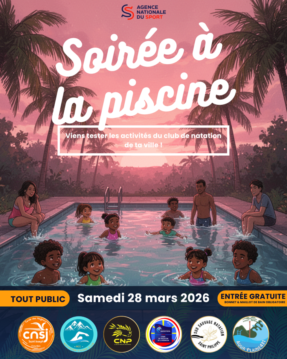 La Ligue de Natation de La Réunion organise ce samedi 28 mars 2026, l’action "Soirée à la Piscine", organisée dans plusieurs communes de l’île. Ouverte à tous, cette soirée - ou matinée selon les sites - a pour objectif de proposer un moment convivial à la piscine, tout en permettant au public de découvrir les différentes activités proposées par les clubs participants. Cinq clubs réunionnais prennent part à l’opération.