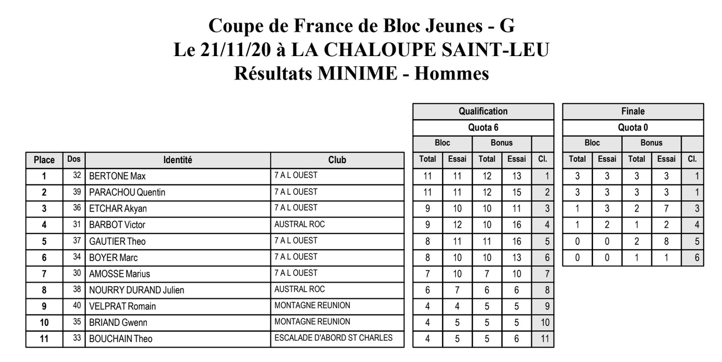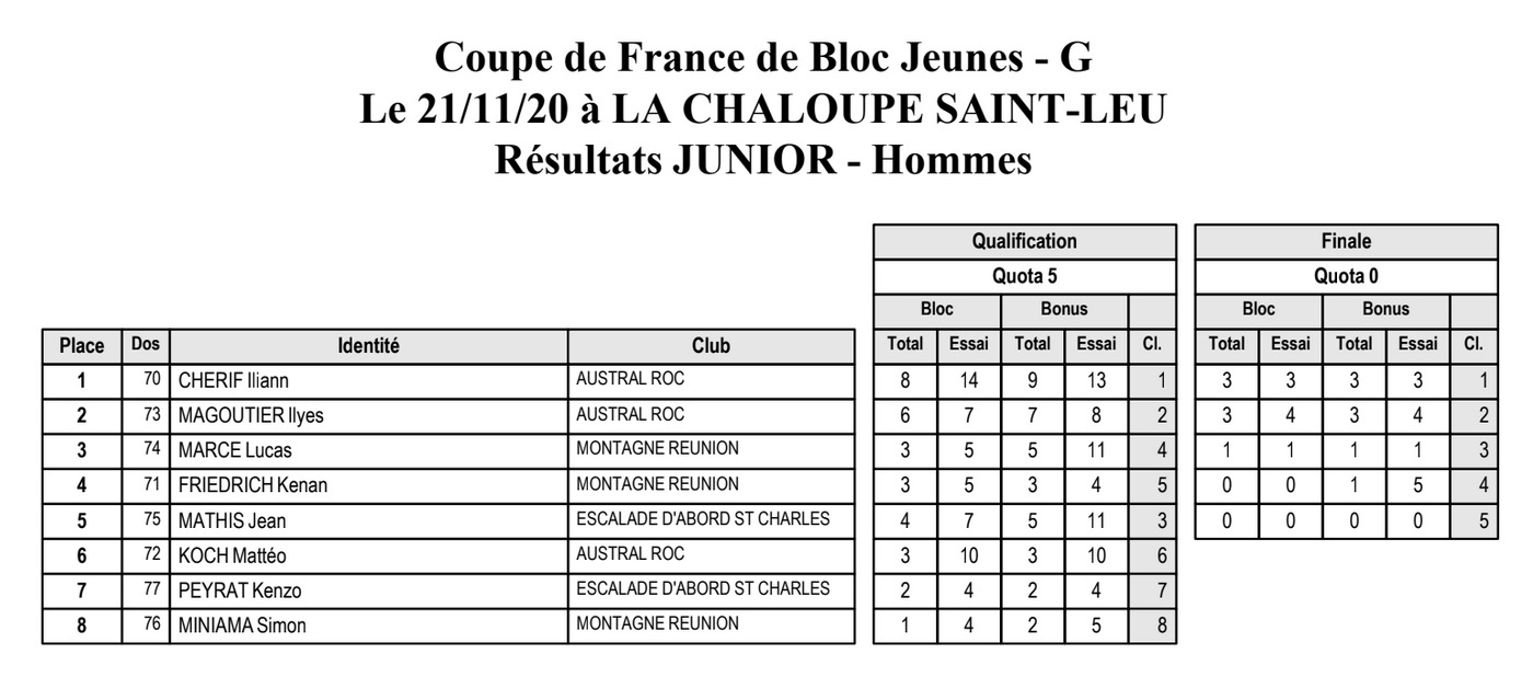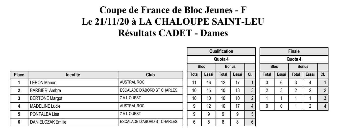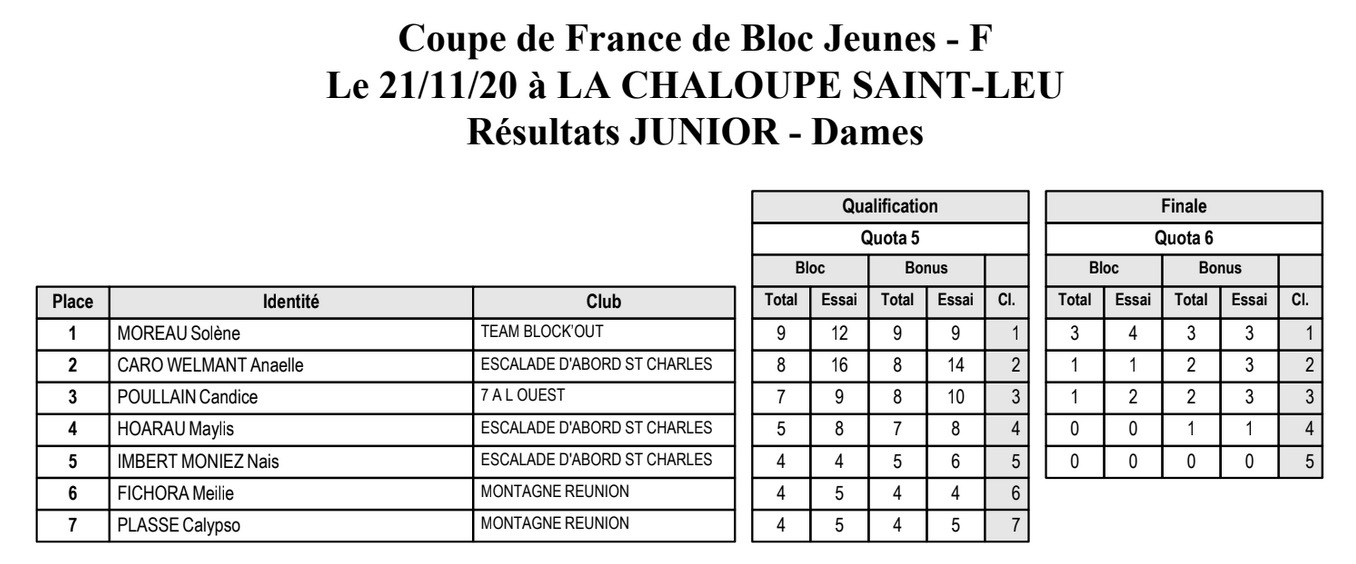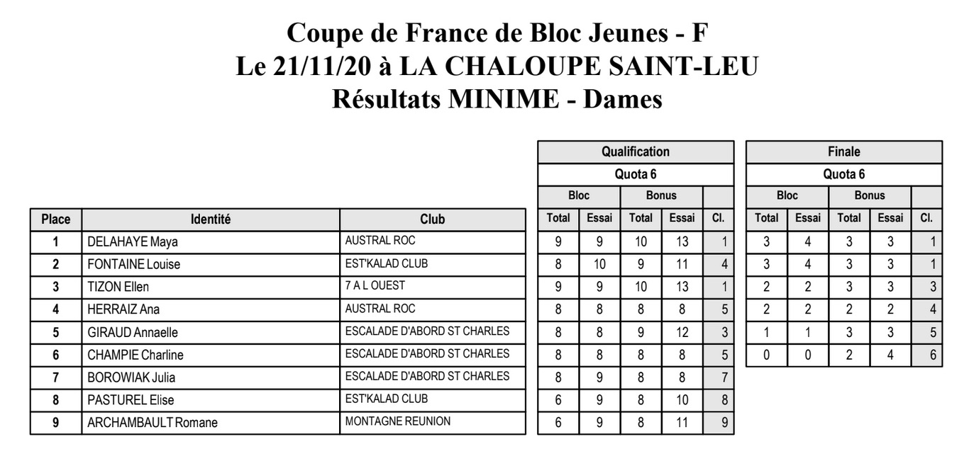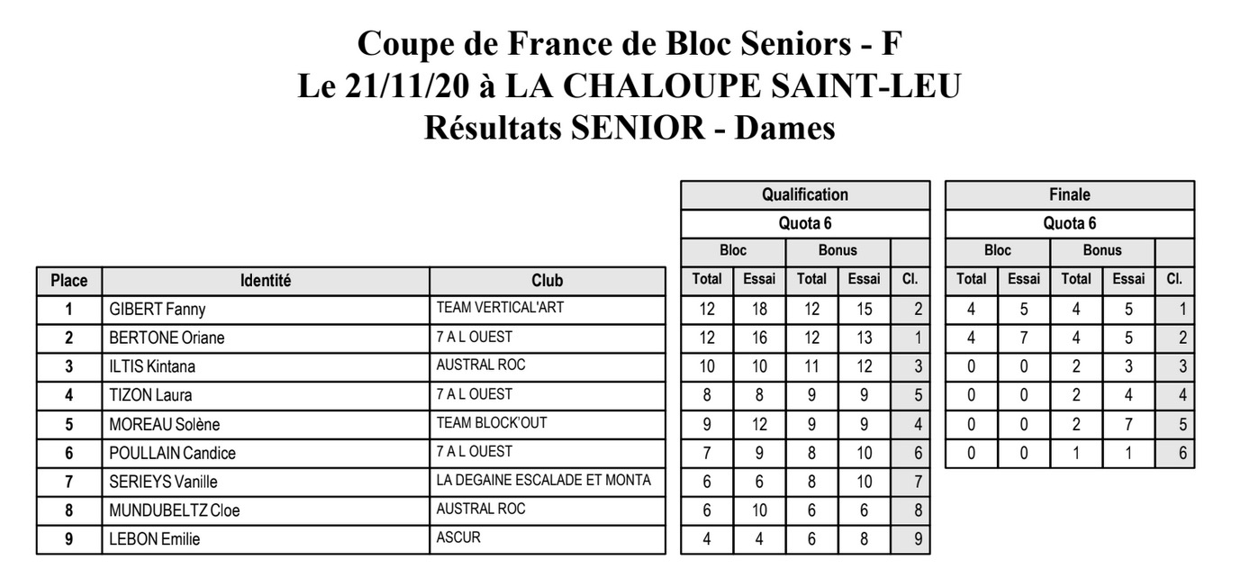 La Coupe de France d'escalade de bloc se termine et les résultats sont tombés. Sans surprise, Fanny Gibert sont au top du podium dans la catégorie senior. Côté hommes c'est Mickaël Mawem qui rafle la médaille d'or. Tous les résultats par catégories ci-dessous. (Photos : FFME 974)