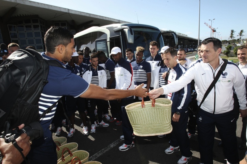 L'équipe de France espoir de football est arrivée à La Réunion ce samedi 24 mai 2014. Zacharie Boucher - le Saint-Pierrois et ancien joueur de l'USS Tamponnaise - a remis à ses coéquipiers des paniers de vacoa. Les Bleuets sont installés à Saint-Gilles et s'entraineront tout au long de la semaine au stade Paul Julius Bénard de Saint-Paul. Ils joueront le 2 juin prochain au stade Michel Volnay de Saint-Pierre face à l'équipe A de Singapour. Ce match amical sera le dernier pour le sélectionneur Willy Sagnol qui s'occupera des Girondins de Bordeaux la saison prochaine.