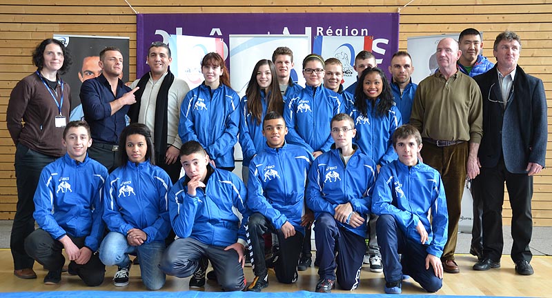Le départ de la grande opération internationale "lutter autour du monde" (Wrestling around the world) a été donné ce mardi 22 avril 2014 au siège de la fédération Française de lutte à Paris par le président Alain Bertholom. Trois jeunes Réunionnais, Emilie Robert (Lutte club Saint-Joseph), Valentin Damour (Lutte club Saint-Joseph) et Camille Clain (Lutte club dionysien) font partie des 15 jeunes lutteurs français sélectionnés pour ce tour du monde (Les lutteurs qui vont participer au Wrestling around the world - Photo D.R.)