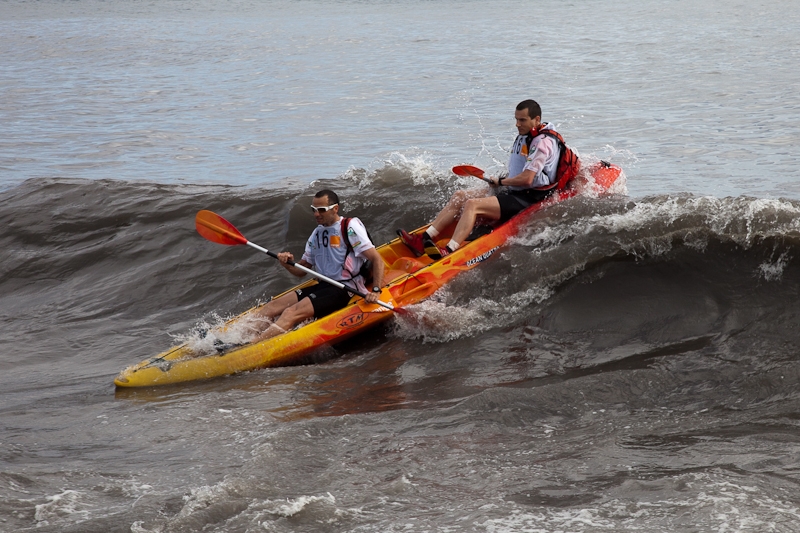 Ainsi, dès les premiers mètres, l'équipe 13, la Team Raid Quechua, et l'équipe 5, Lafuma Vibram, ont pris les choses en main, franchissant deux radiers successifs avant de déboucher un peu plus loin sur l'océan. Une fois domptée la petite barre, courte et sèche mettant à mal quelques embarcations retardataires, la flottille s'est dirigée vers Saint-Denis où elle est arrivée après plus d'une heure de mer.Sur la plage, les kayaks ont été échangés contre les VTT. A grande pédalées, suivant le front de mer jusqu'au Barachois, le peloton a bifurqué vers la rue de Paris et sa belle alignée de cases coloniales. S'est ensuivie une première grimpée jusqu'à l'allée des Fluorines (check point n°5) où les premières équipes ont basculé aussitôt dans une section canyonning plutôt éprouvante. Pas moins de neuf rappels attendaient les concurrents, dont le premier affichait un saut de 140 mètres à la verticale.