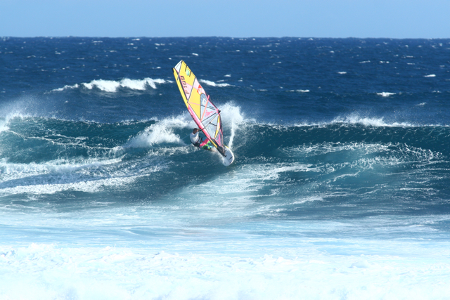 Vers 14h30, les vagues atteignaient parfois plus de 4 mètres. Le vent était très irrégulier mais il y a moyen d'exploiter les conditions. Cependant, pas de quoi envoyer une manche officielle. Pour cela, une " super session " improvisée fut largement profitable à tous. Le but du jeu était simple : tous les coureurs naviguaient pendant 1 heure en donnant le meilleur d'eux-mêmes. Ils étaient jugés à l'impression générale par des planchistes locaux recrutés pour l'occasion, et seuls les 3 meilleurs étaient couronnés.S'il est vrai que ce samedi après-midi, le vent privilégiait plutôt les petits gabarits, il fallait une bonne connaissance du spot et une sacrée expérience dans les vagues pour exploiter au mieux ces conditions déjà " radicales " : courant, vent irrégulier et mal orienté, vagues qui ferment... A ce petit jeu, c'est le guadeloupéen Camille Juban qui a assuré une prestation irréprochable. Il connaissait le spot comme sa poche pour avoir participé aux 2 précédentes éditions et possédait une lecture de vagues et un style qui ont fait pencher les juges en sa faveur.