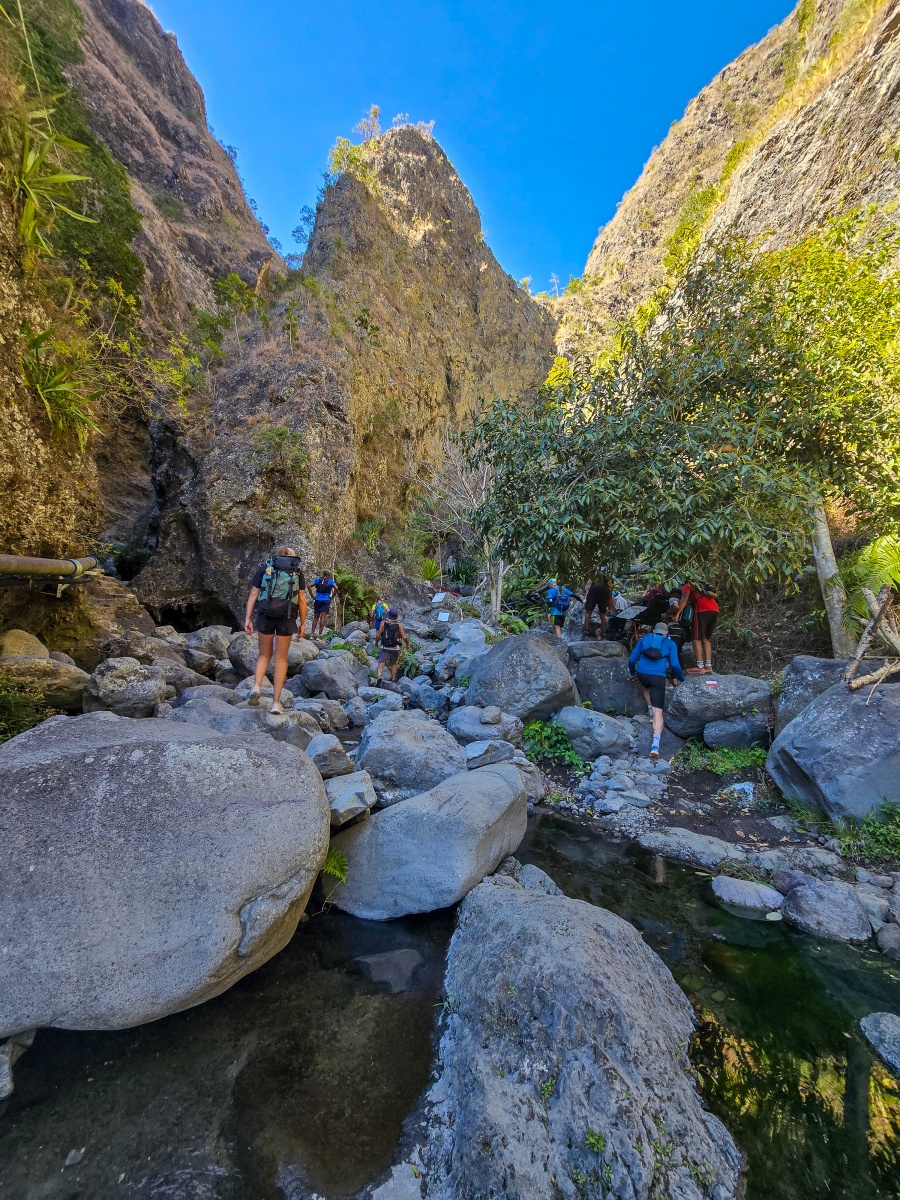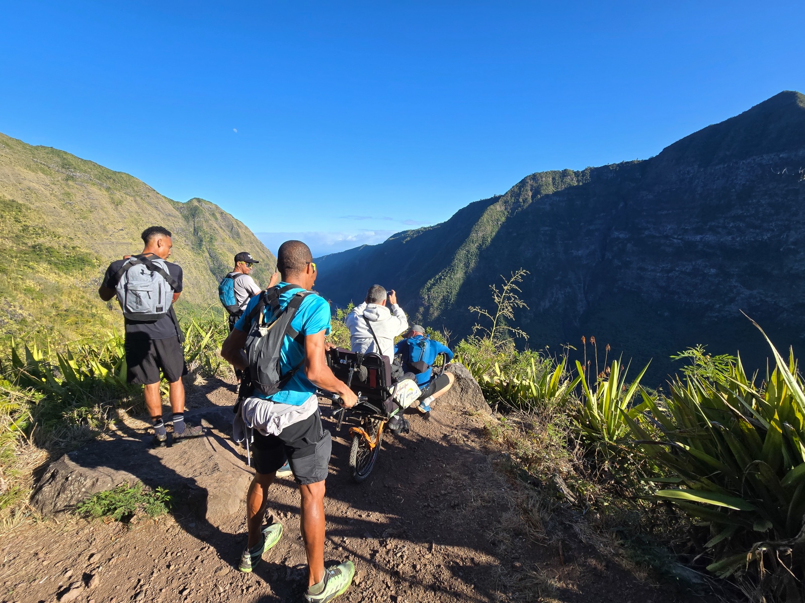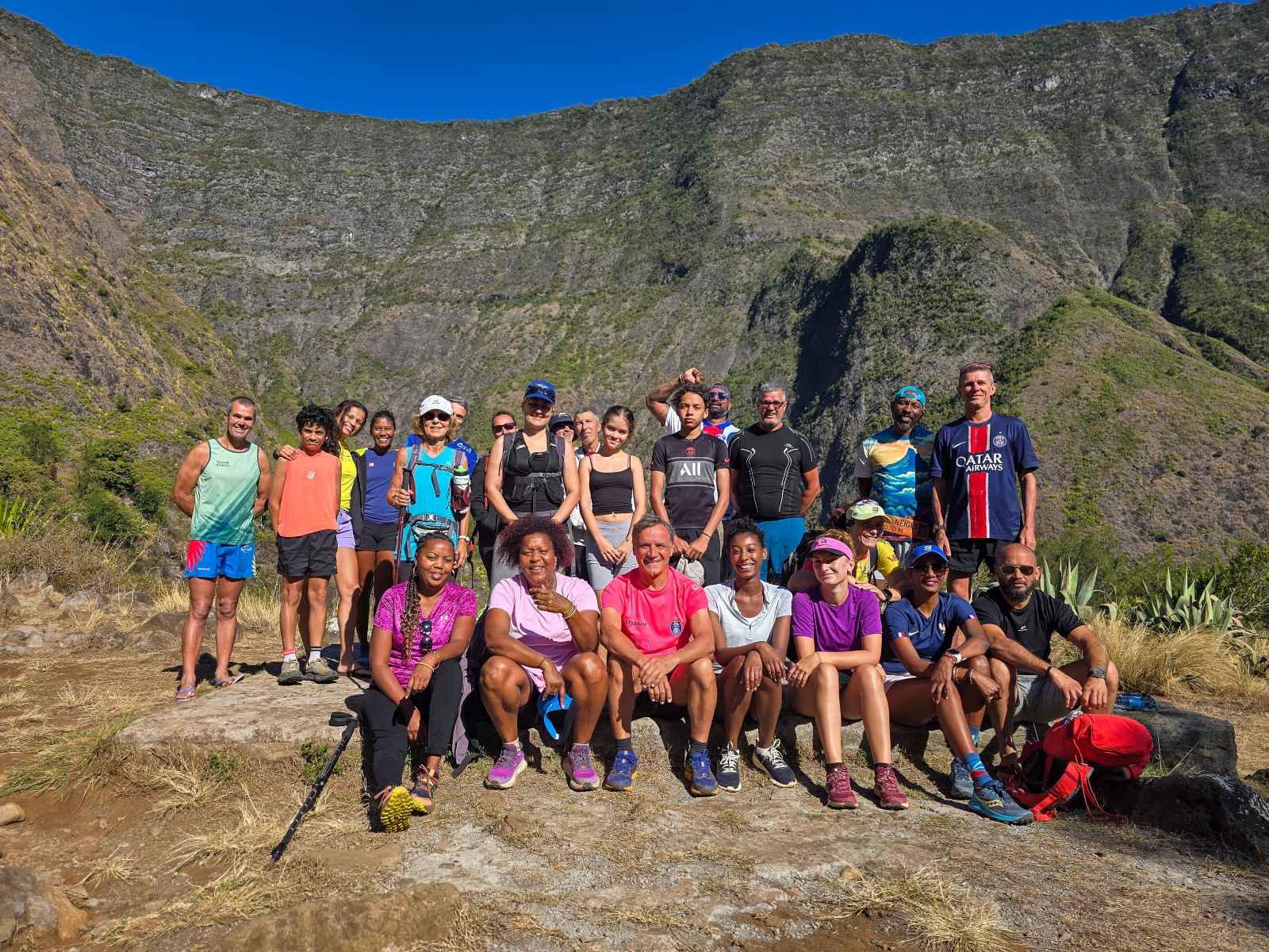 Ils étaient 43 à partir sur les sentiers en direction de Mafate ce samedi 11 octobre 2025. Parmi les marcheurs, les adhérents de l’association PSG Official Supporters Club La Réunion, des éducateurs de la maison d’arrêt du port, et une joëlette. Une journée solidaire organisée par les supporters du PSG à la Réunion. ( Photo : Frédéric Folio)