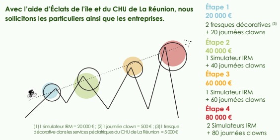 Partenaires du projet, l'association Éclats de l'île et les CHU de Saint-Pierre et Saint-Denis pourront, grâce aux dons, organiser des passages de clowns dans les services pédiatriques. La somme amassée par cette opération a aussi pour objectif de mettre à disposition des hôpitaux deux IRM pour enfants. Ces simulateurs spécialisés permettent "d'éviter les anesthésies générales et autres traitements lourds, explique Mathieu Bonnefon. Ils aident à capter l'attention des enfants afin de réaliser l'examen sans difficulté." Des fresques décoratives dans les services pour enfants sont également concernées par ce projet qui verra Mathieu Bonnefon parcourir près de 500km et affronter 13 000m de dénivelé positif.