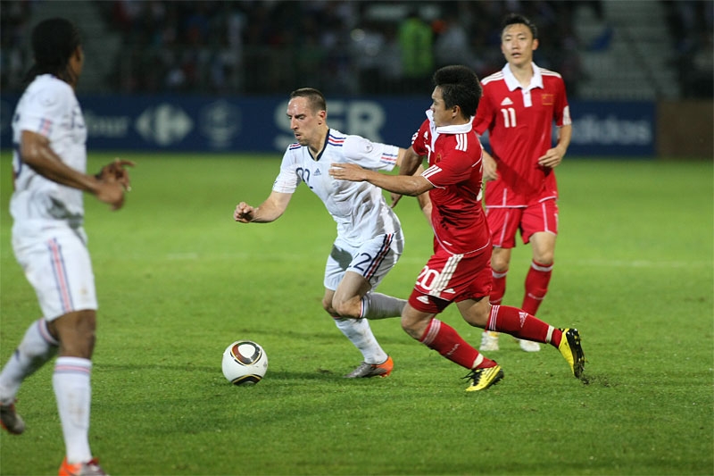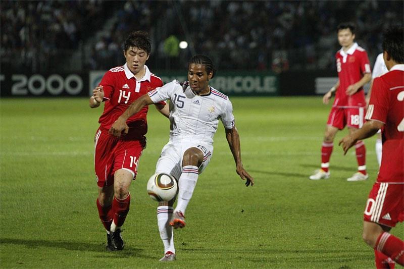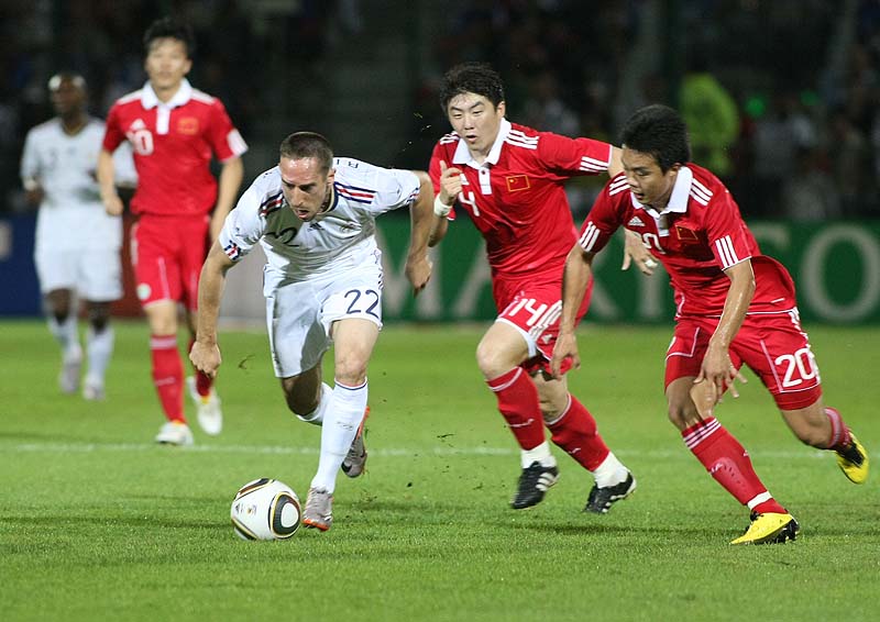 Dès la 1ère minute, Malouda donnait le tempo avec un tir cadré détourné par le gardien chinois, Zheng Cheng. Un rythme maintenu tout au long du match au regard des nombreuses occasions que se sont créées les joueurs de l'équipe de France, notamment une talonnade de Gallas à la 12ème minute qui trouve le chemin des filets. Un but refusé pour hors-jeu du défenseur français. L'équipe de France parviendra à se créer d'autres occasions durant la première mi-temps, notamment un coup franc de Franck Ribery (20ème) ou encore une tête de Gallas qui passera à gauche du poteau (34ème).Néanmoins, malgré ces nombreuses occasions, les Français n'ont pas réussi à les concrétiser. Et pour cause, les Bleus ont multiplié les erreurs techniques, ne parvenant pas à accomplir le dernier geste. Du côté des Chinois, les coéquipiers de Zheng Cheng n'ont pas été très dangereux si ce n'est quelques coups de pieds arrêtés à l'entrée de la surface de réparation française (9ème et 45ème minute).