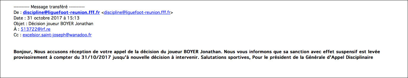 Jonathan Boyer avait donc bel et bien le droit de disputer ce 7ème tour de Coupe de France. Le jour de la commission disciplinaire qui décidera de lever l'effet suspensif de la décision à la ligue est même connu : "le 24 novembre prochain" indique le président Amanville.