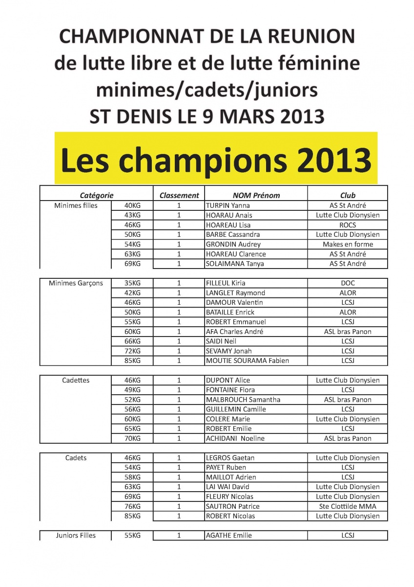 Le Dojo régional de Champ Fleuri (Saint-Denis) a accueilli ce samedi 9 mars 2013 les championnats de La Réunion de lutte libre et de lutte féminine. 10 clubs étaient en compétition. Ces championnats ont vu les belles performances du LC Saint-Joseph, qui se hisse en tête du classement général par clubs. Le club a fait main basse sur plusieurs premières places, toutes catégories confondues. Il est suivi par le LC Dionysien et le ROC Salazie.