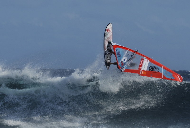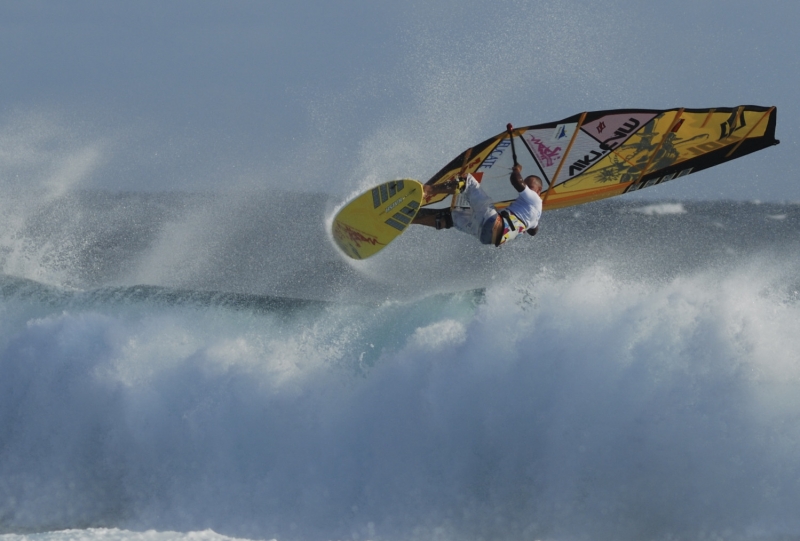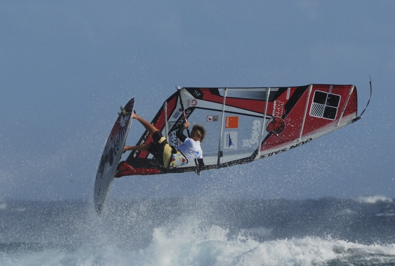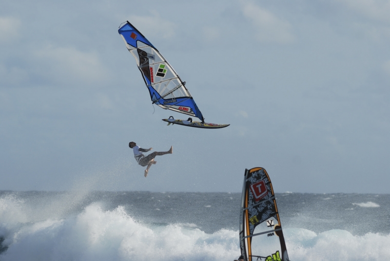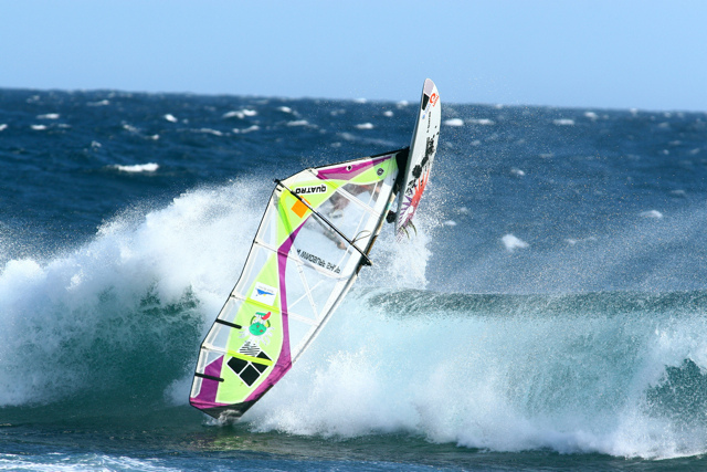 Si les vagues ne rentraient pas régulièrement, il y avait quand même quelques bons sets qui affichaient une taille raisonnable, parfois plus de 2 mètres. Mais il fallait aujourd'hui avoir un bon timing pour les chevaucher et envoyer de grosses man?uvres au bon moment. Pour preuve, il y a encore eu de la casse. Pas moins de 4 mâts cassés et 2 voiles déchirées. Dans ces conditions de vent encore fort et de vagues sournoises, le public et les juges ont eu droit à un nouveau festival de gros aerials, de goyters, 360, aerial forward loops et de bons gros surfs bien appuyés.