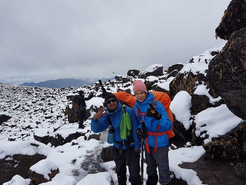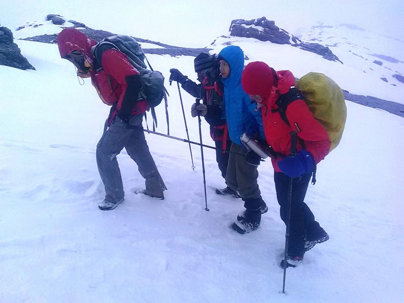 Rapidement, nous marchons dans la neige, ce qui semble exceptionnel d'après nos guides. Les organismes sont mis à rude épreuve. Certains d'entre nous sont sujets à des vomissements. Lucas a envie de vomir, mais il n'y arrive pas. Il a de fortes douleurs à l'estomac, mais il avance au mental ! En montant, nous croisons deux guides avec leur client qui est porté car il tient à peine sur ses jambes !