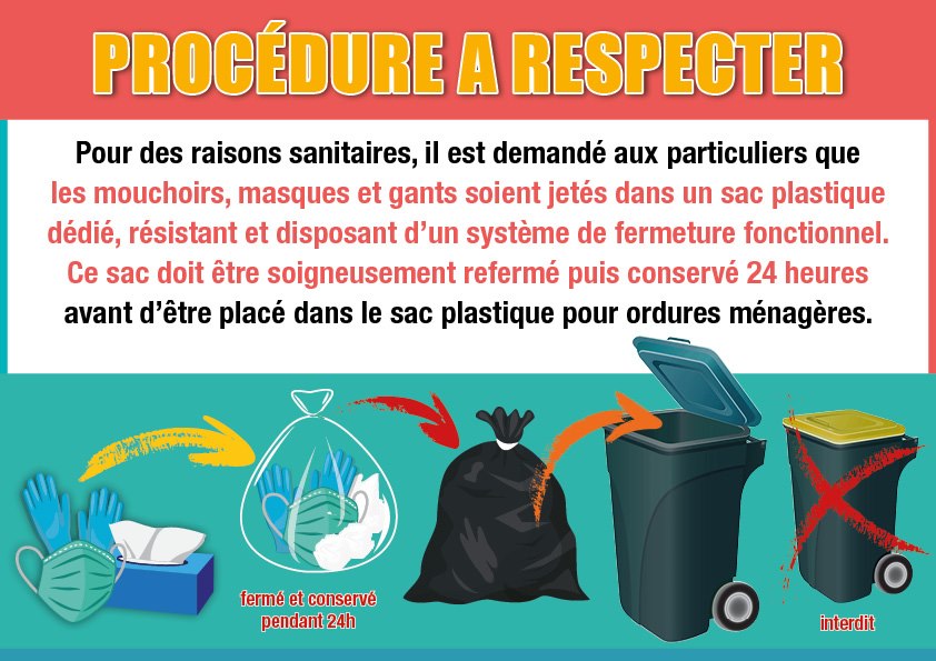 Pour les protéger et contenir la propagation du Covid-19, merci de respecter scrupuleusement les consignes suivantes concernant les mouchoirs en papier et les équipements de protection individuelle (masques et gants) usagés :