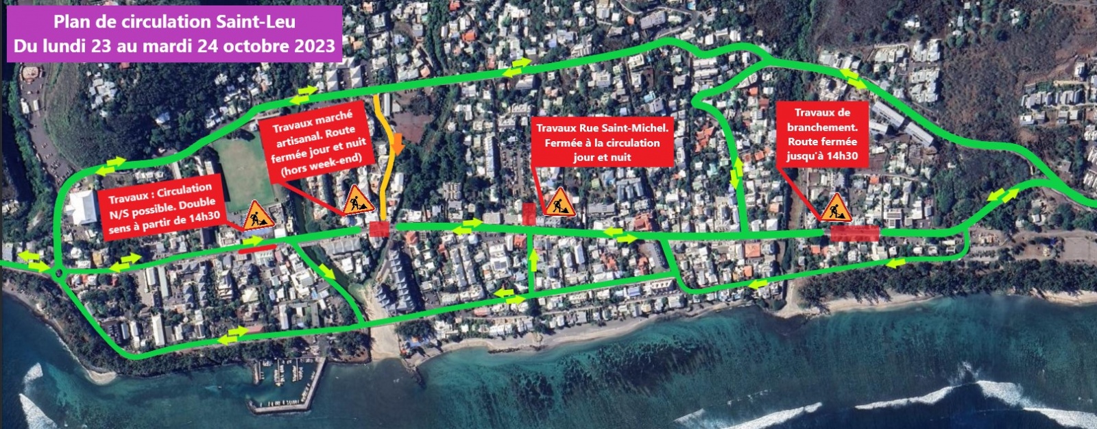 • Atelier au marché artisanal : La RN1A sera fermée à la circulation jours et nuits (hors week-end). Des itinéraires alternatifs seront mis en place pour assurer la continuité de vos déplacements.