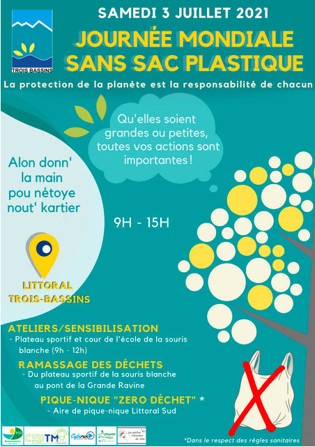 A l'occasion de la Journée mondiale sans sac plastique le samedi 3 juillet 2021, la ville de Trois-Bassins, en partenariat avec le Territoire de la côte ouest organise différents ateliers de 9h à 15h. Au programme une action sensibilisation au plateau sportif et à la cour de l'école de la souris blanche de 9h à 12h. Un ramassage de déchets aura également lieu du plateau sportif de la souris blanche au pont de la grande ravine. Un pique-nique "zéro déchet" sur l'aire de pique-nique du littoral sud aura lieu. Cette journée se déroulera dans le respect des règles sanitaires. Découvrez le programme détaillé ci-dessous. (Photo d'illustration rb/www.ipreunion.com)