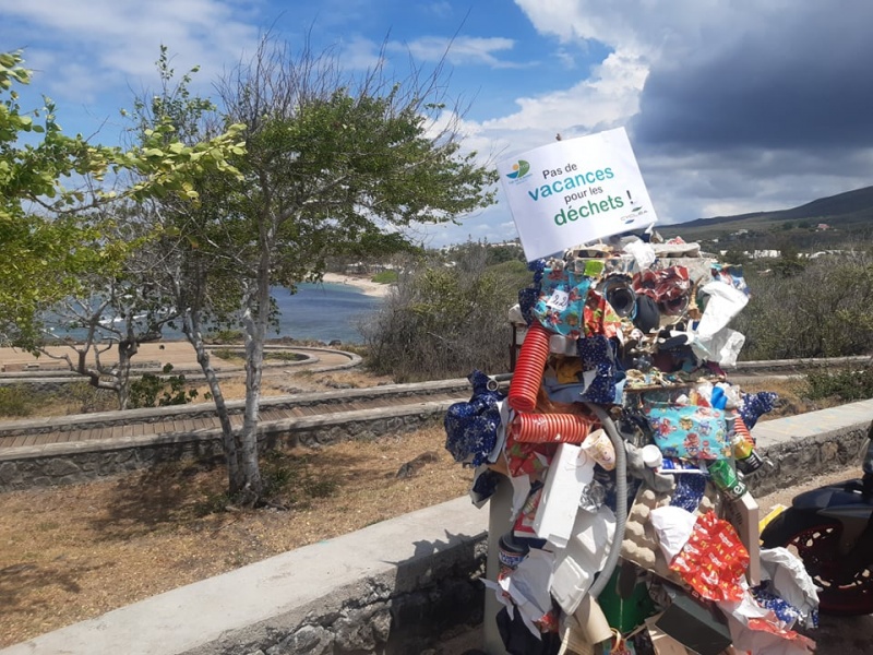 Les médiateurs et leur sculpture composée de déchets nommée "detritos" souhaitent interpeller les vacanciers. Cet étonnant personnage a pour but de sensibiliser à la bonne gestion des déchets et d'inciter au zero-déchets. (Photo TCO)