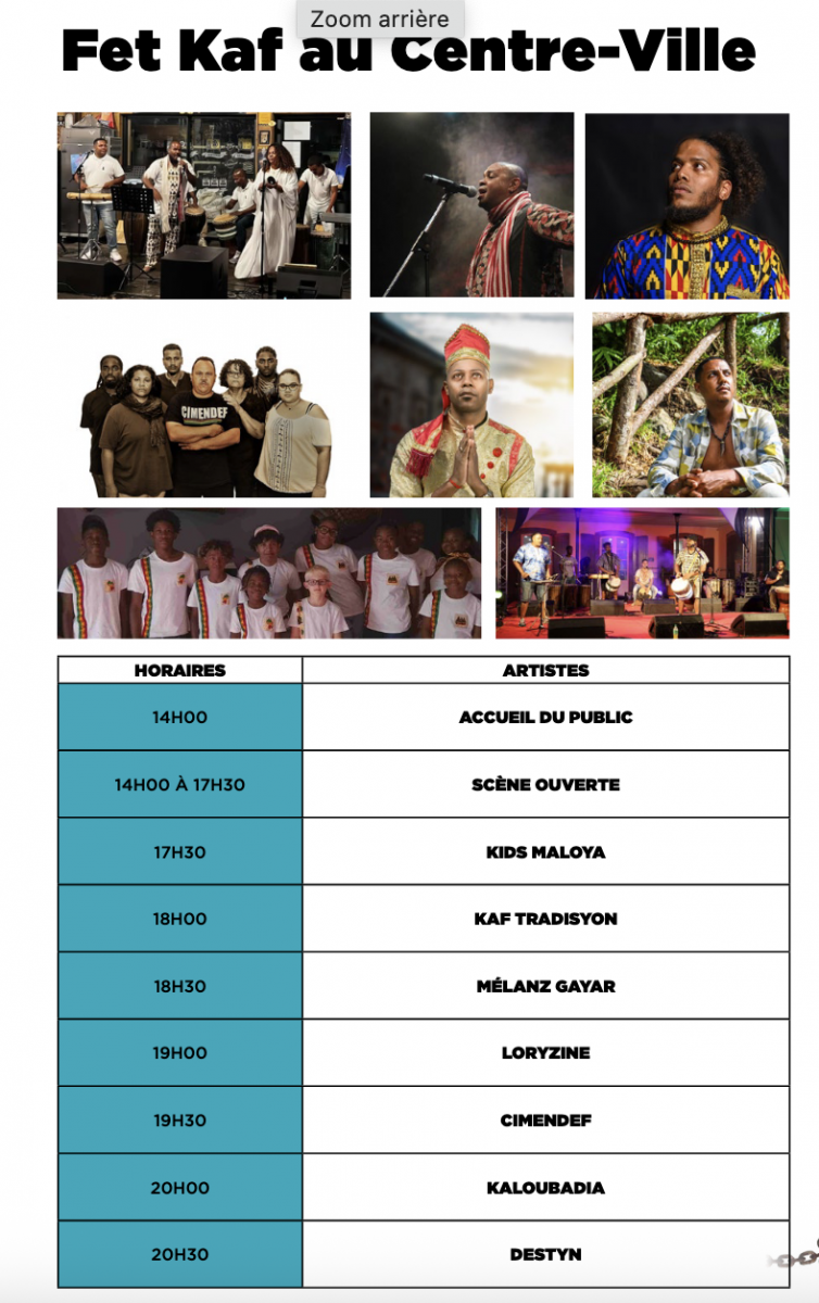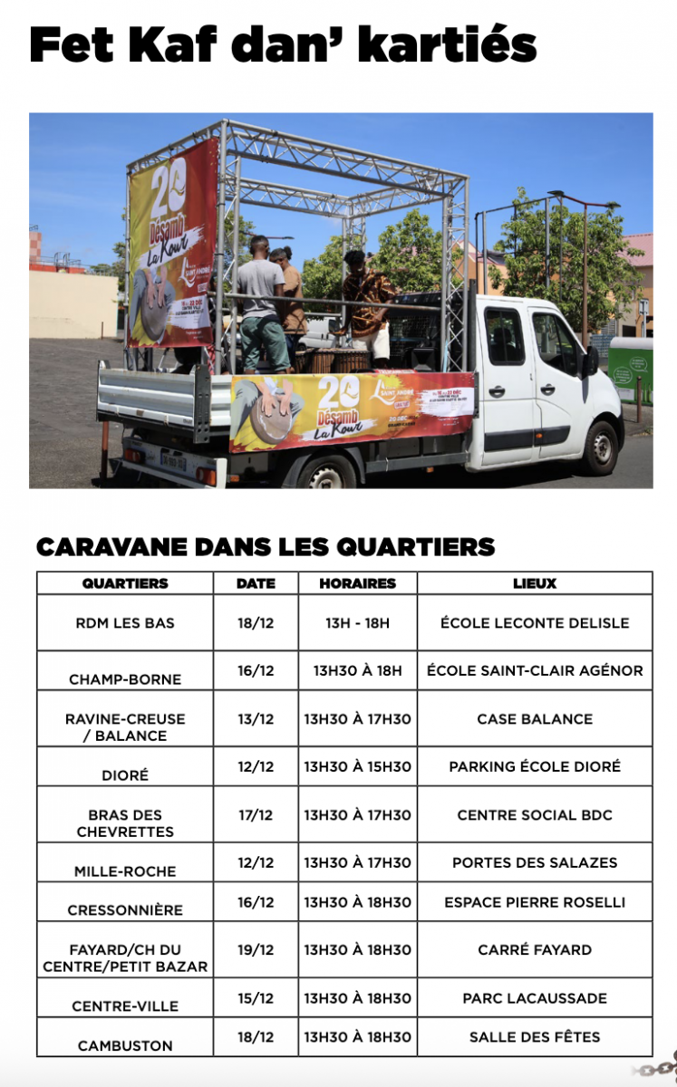 Et la désormais incontournable caravane maloya, qui fera étape chaque jour dans un quartier différent avec un groupe de maloya pour faire vivre la mémoire en musique.