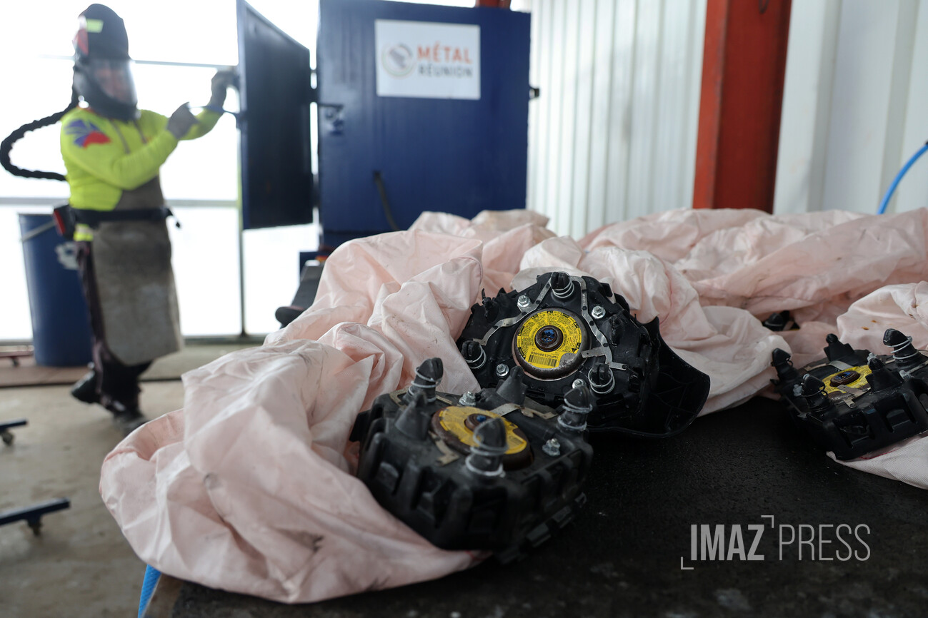Au Port, l'entreprise Métal Réunion est la seule habilité à prendre en charge ces airbags. Exceptionnellement, Imaz Press a pu se rendre sur les lieux où les airbags sont traités. Ce jour-là – pour des raisons de sécurité – l'activité était à l'arrêt. Regardez.