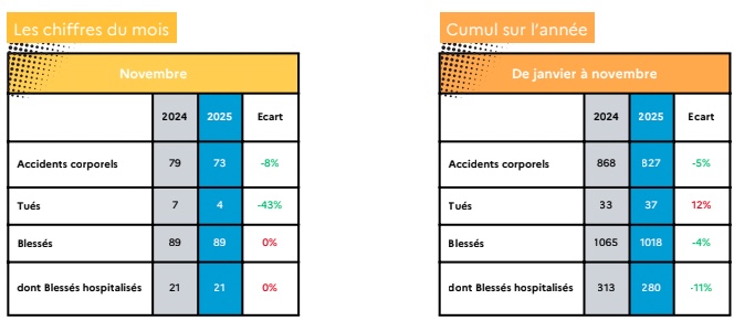 En novembre 2025, quatre personnes sont décédées dans des accidents de la route, 1.039 ont été blessées et 286 hospitalisées, pour un total de 849 accidents corporels.