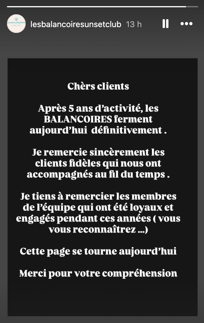 "Après 5 ans d'activité, les Balançoires ferment aujourd'hui définitivement" le restaurant, sans pour autant préciser les raisons de cette fermeture.