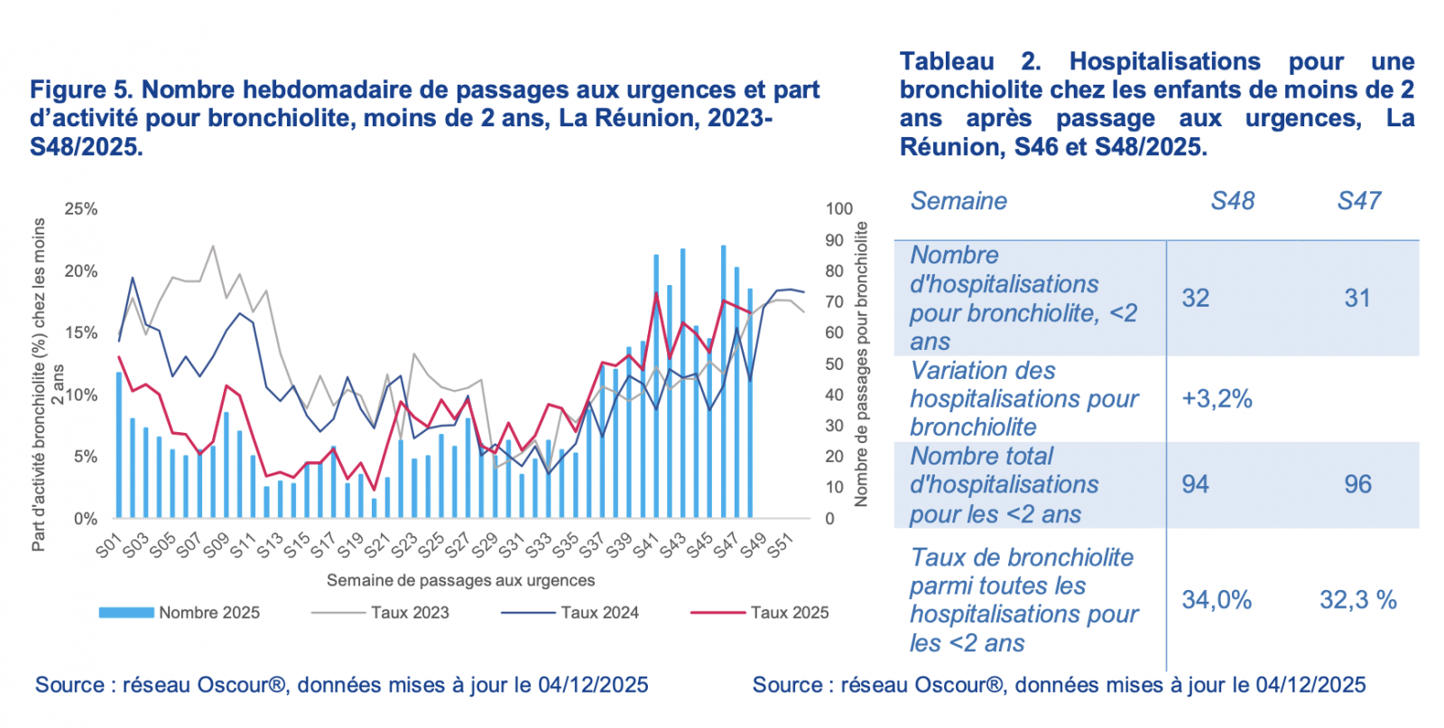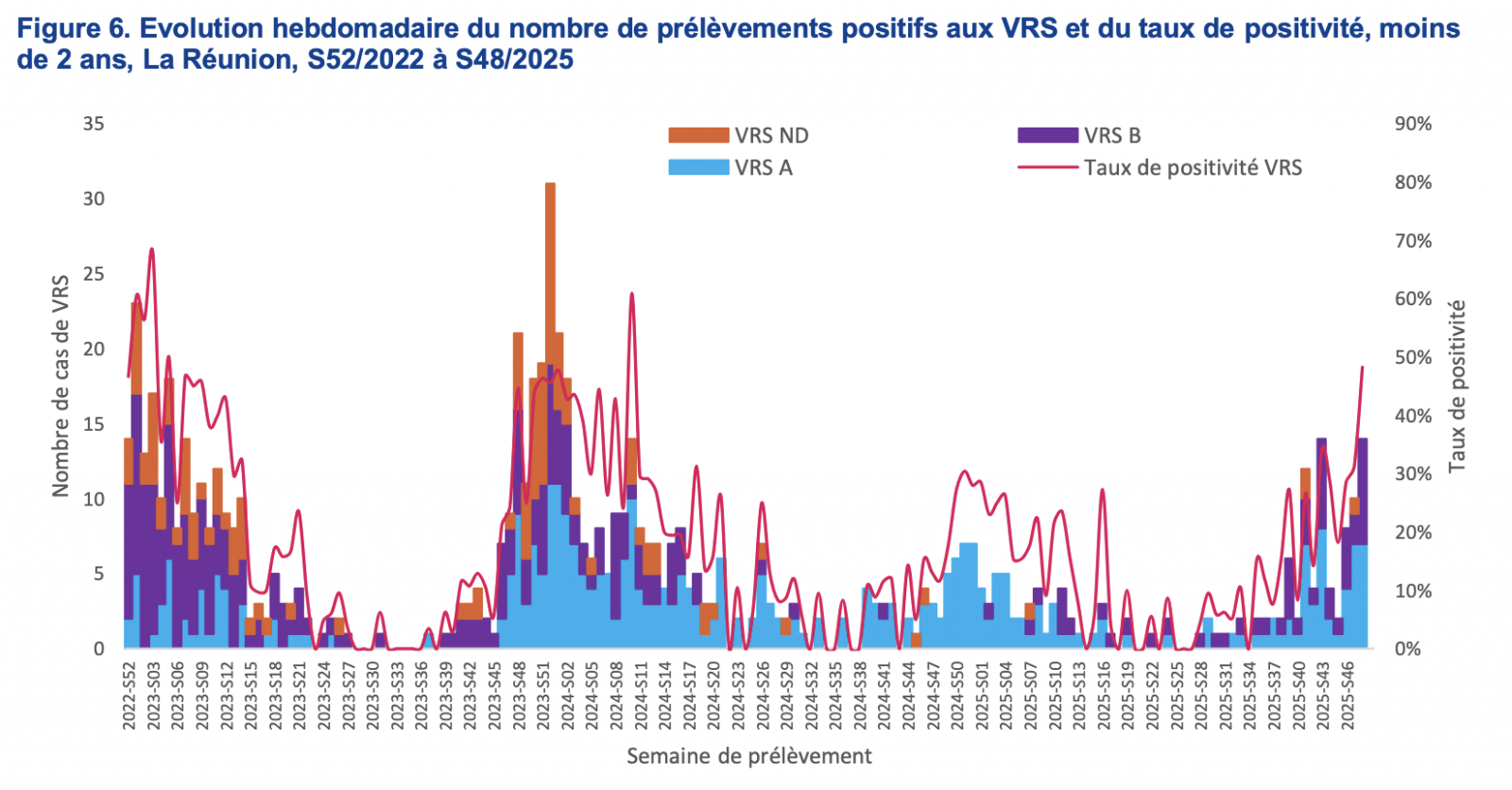 Les données de la surveillance virologique à partir des données du laboratoire de microbiologie du CHU (CNR Associé Virus respiratoires, La Réunion) montraient une forte progression du taux de positivité. En S48, le taux de positivité était de 48% contre 31% en S47, avec une co-circulation des VRS de type A et de type B.