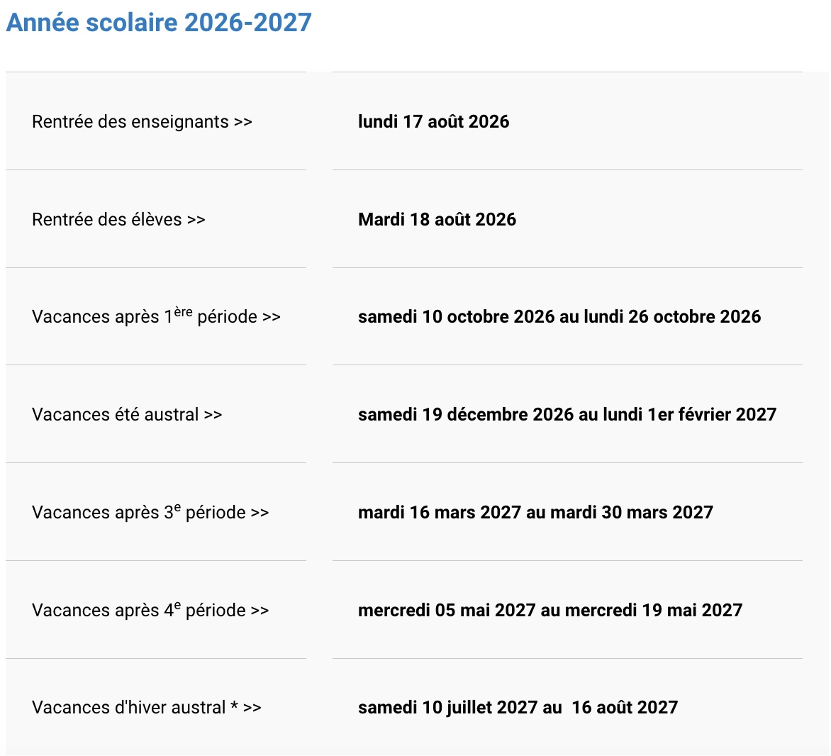 Les vacances d'été australe, qui duraient jusqu'ici 4 semaines et demi, dureront désormais 6 semaines, avec un départ en vacances le 19 décembre 2026 pour un retour sur les bancs de l'école le 1er février 2027.
