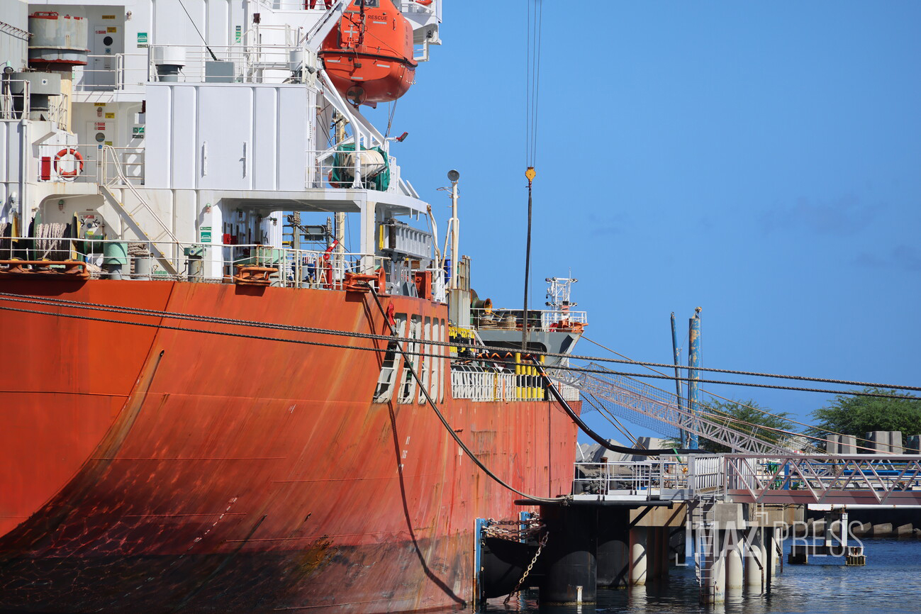 Après la découverte de 11 millions de litres de sans-plomb impropres à l'utilisation, stockés au dépôt pétrolier du Port, une opération de réexpédition a débuté ce vendredi 24 avril 2026 . Des pipelines ont été mis en place au port ouest pour permettre le transfert du carburant, qui va être réexpédié par voie maritime vers un site industriel extérieur au territoire. L'opération avait été autorisée par arrêté préfectoral le 10 mars dernier (Photo Richard Bouhet/www.imazpress.com)