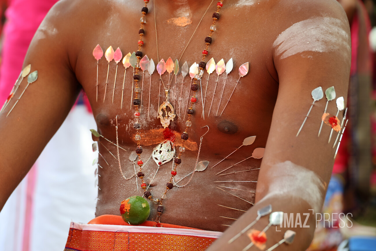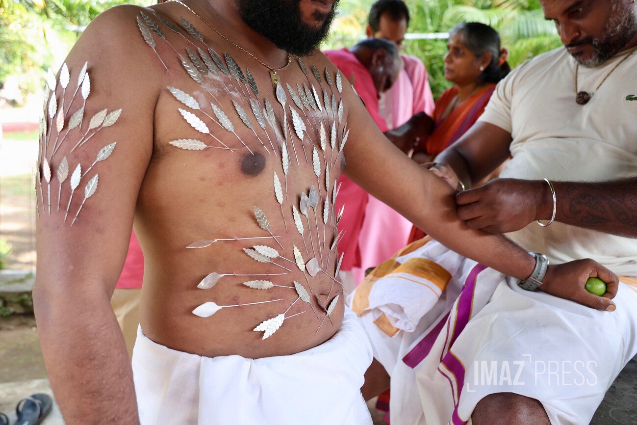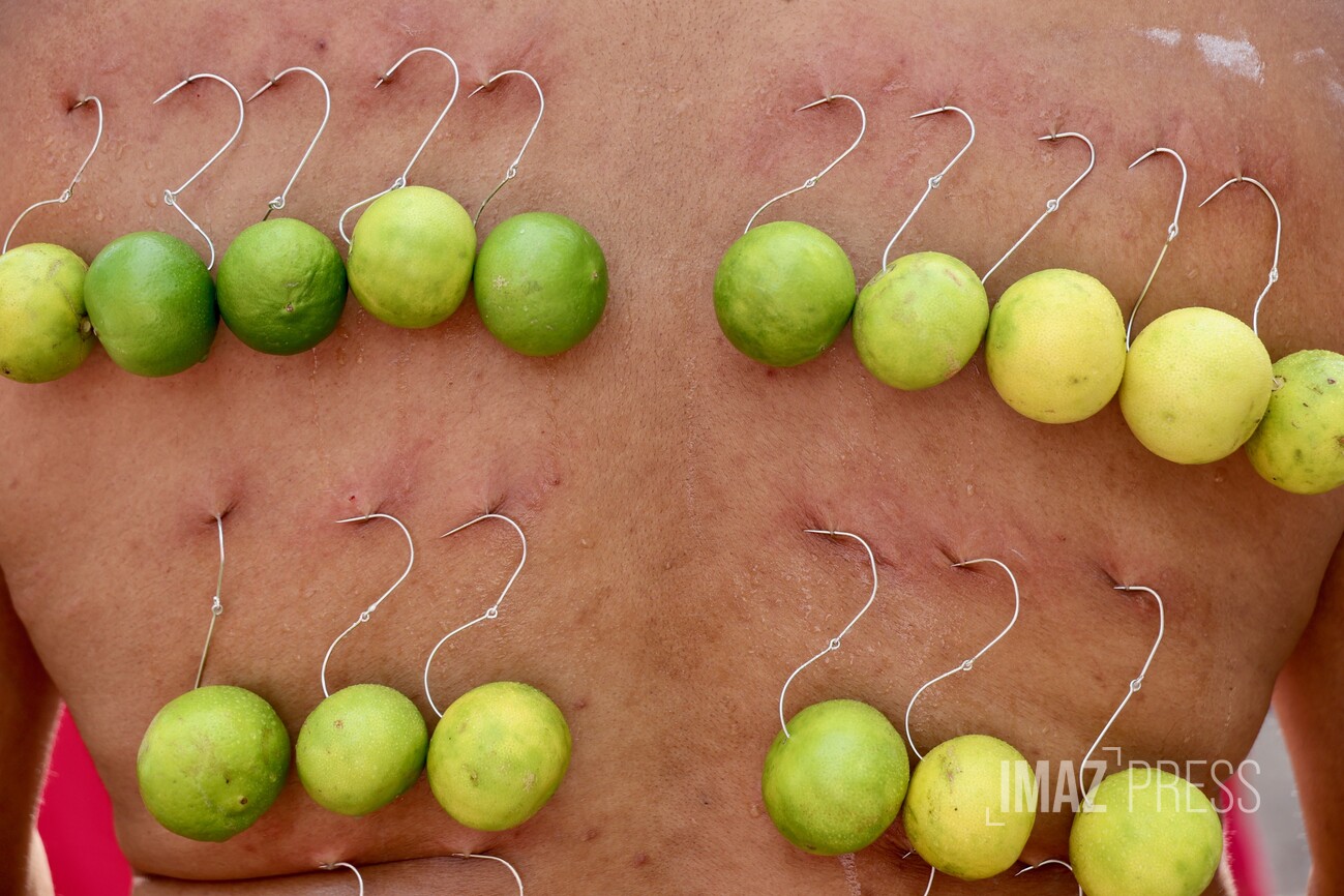 Le corps transpercé d’aiguilles d’argent, ils soutiennent un portique, le Cavadee, décoré de fleurs, feuillages et icônes. Les aiguilles, plantées notamment dans la langue, matérialisent le voeu de silence.