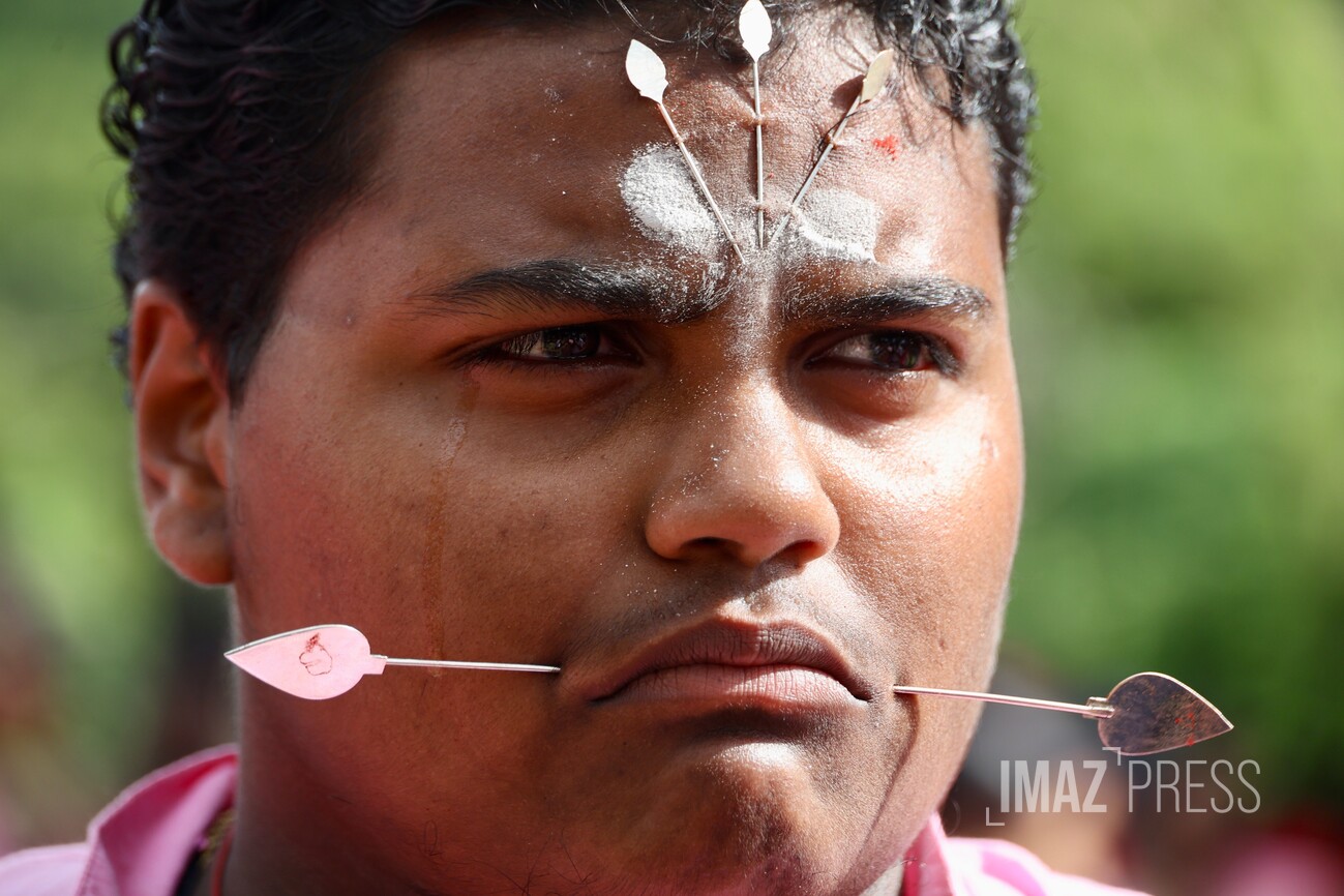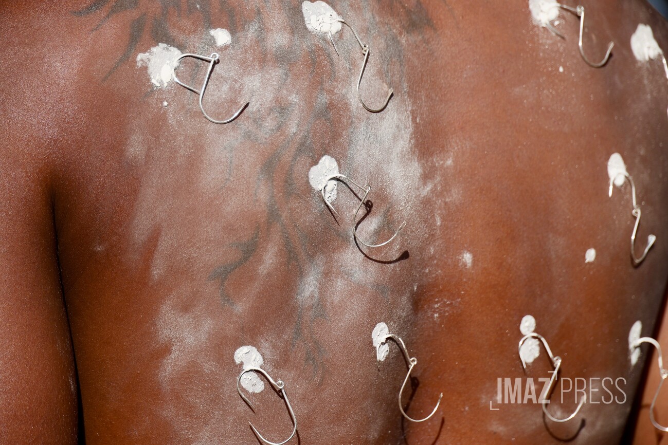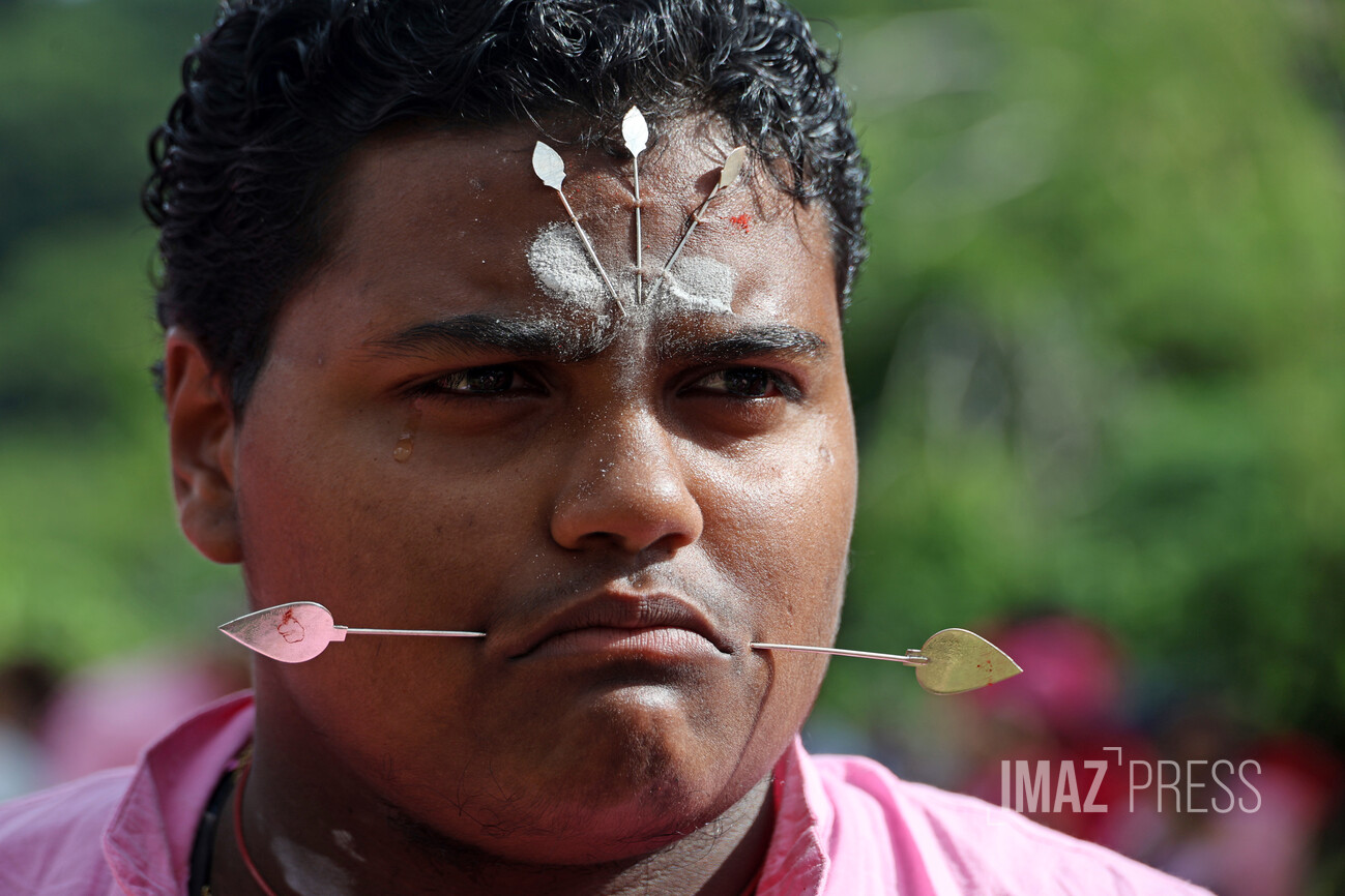 Le corps transpercé d’aiguilles d’argent, ils soutiennent un portique, le Cavadee, décoré de fleurs, feuillages et icônes. Les aiguilles, plantées notamment dans la langue, matérialisent le voeu de silence.