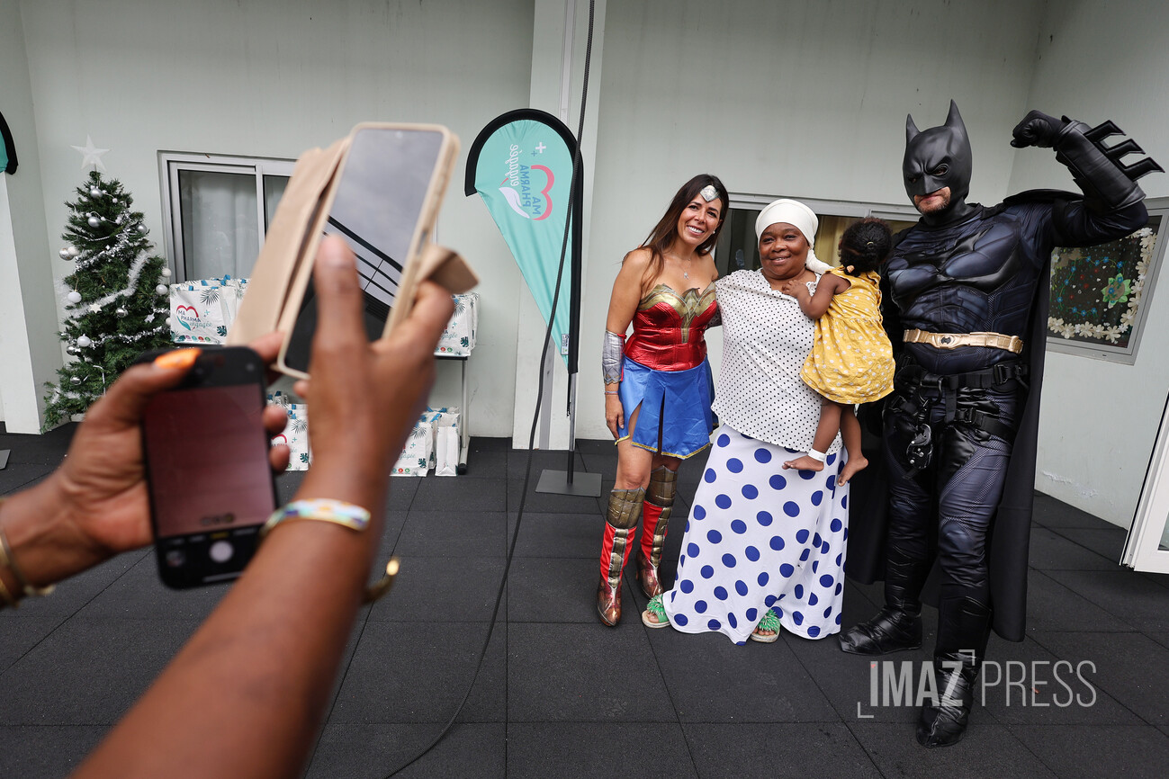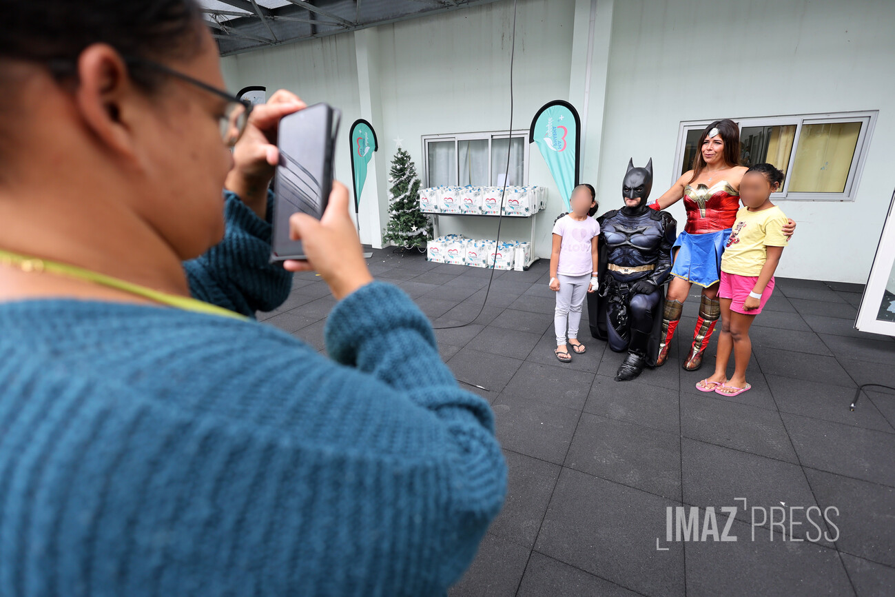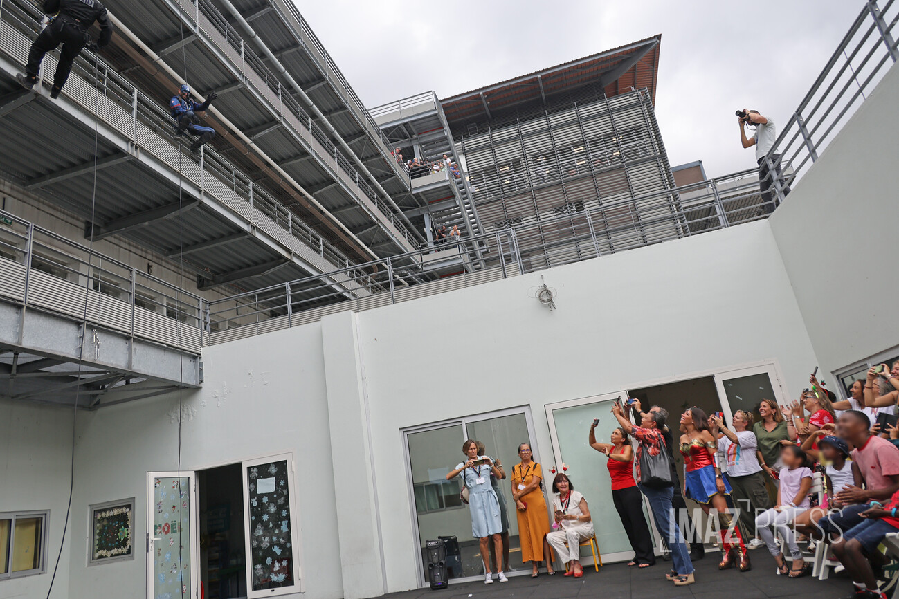 Ce mercredi 10 décembre 2025, les membres du RAID Réunion, costumés en super-héros, sont venus rendre visite aux enfants hospitalisés au CHU de Bellepierre. Au programme : deux descentes en rappel depuis la façade de l'hôpital au niveau du patio de la pédiatrie. (Photo sly/www.imazpress.com)