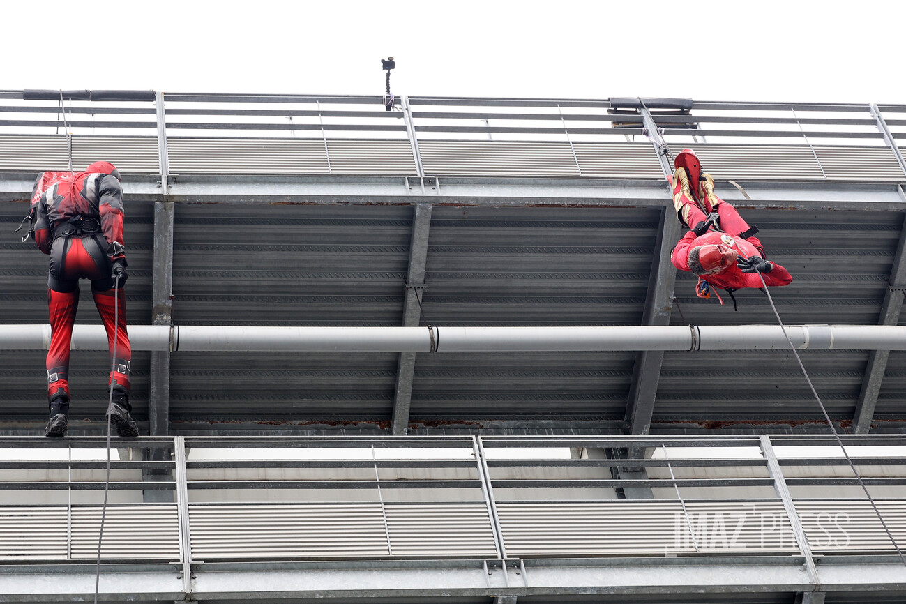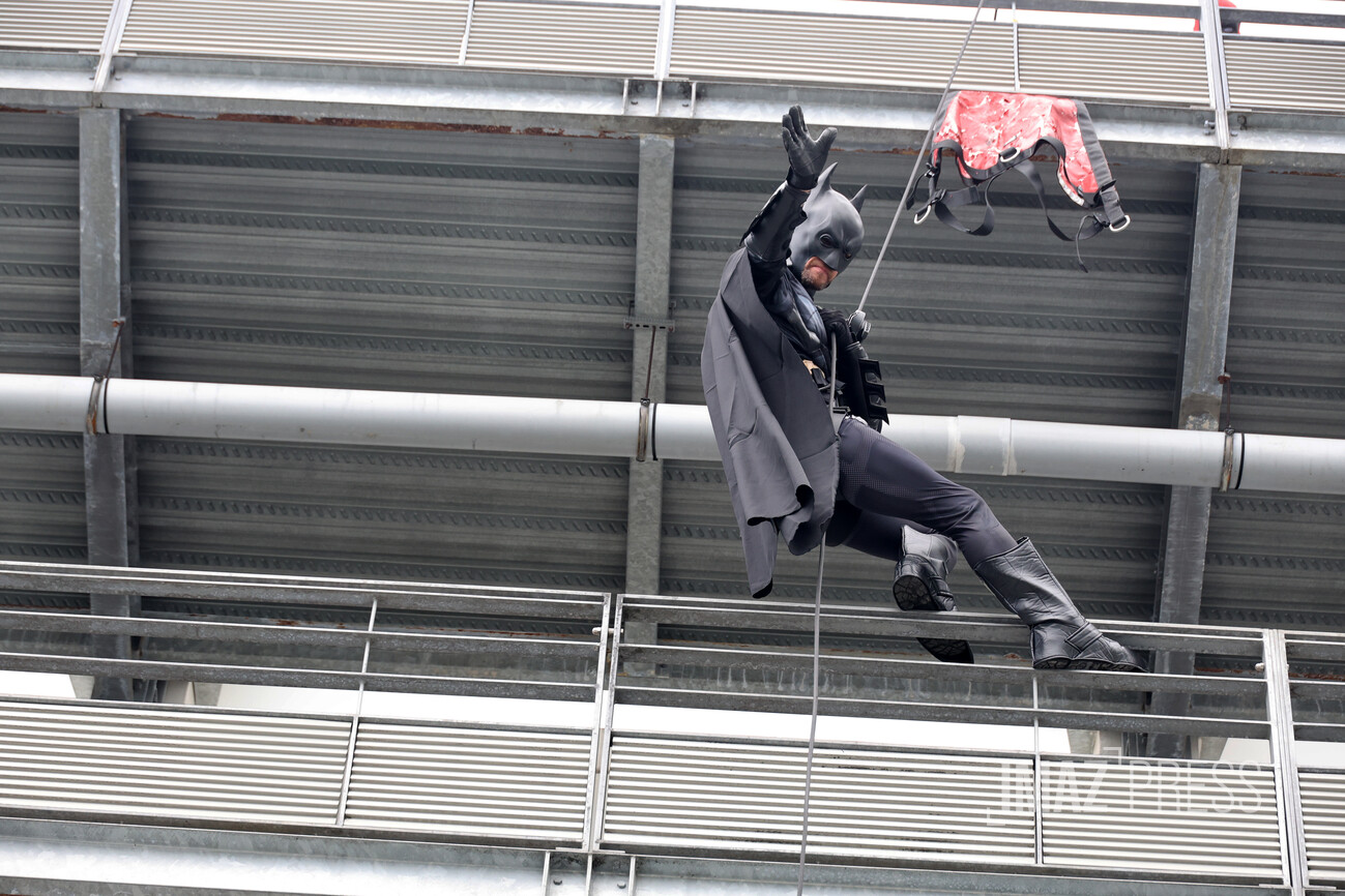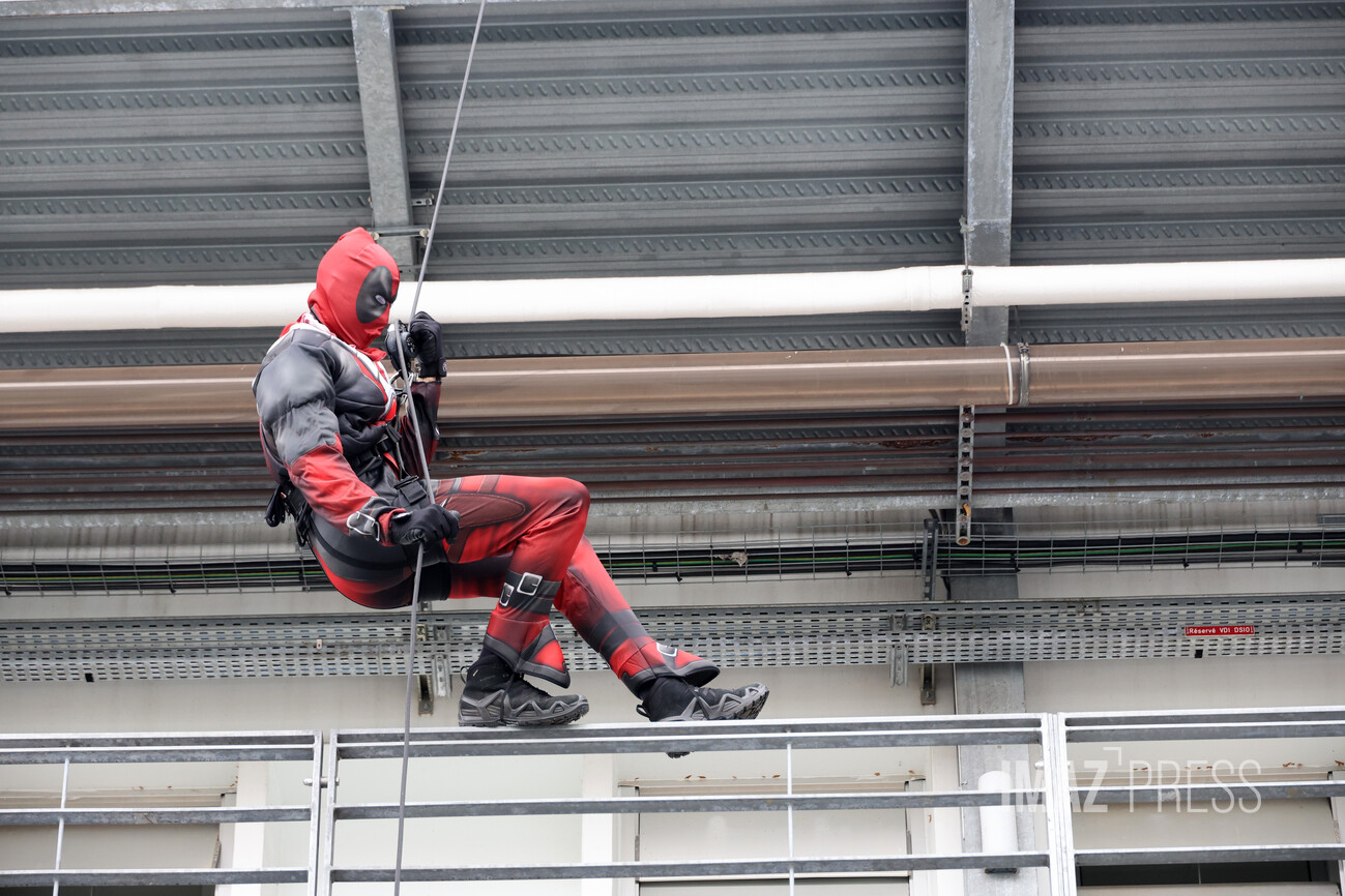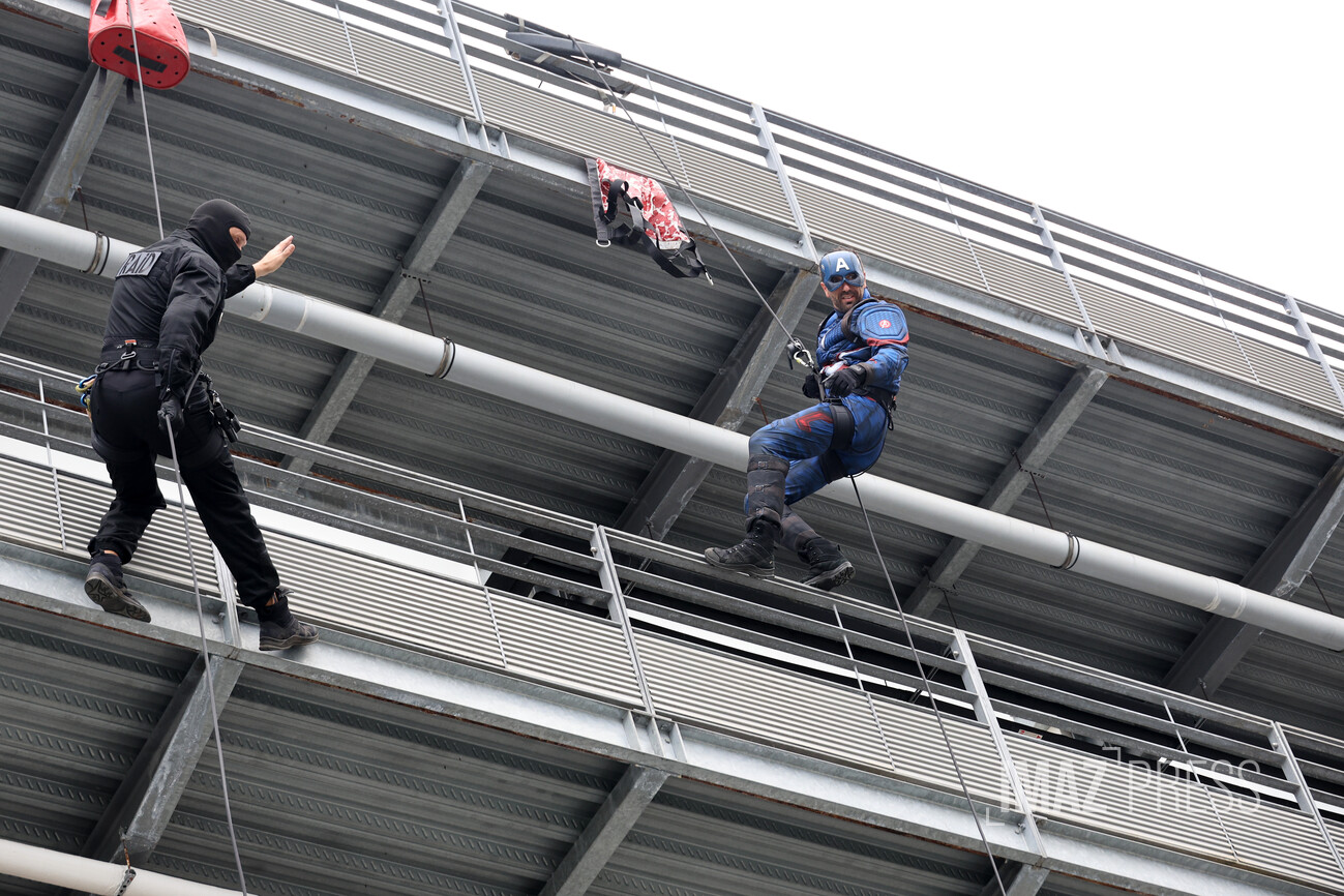 Ce mercredi 10 décembre 2025, les membres du RAID Réunion, costumés en super-héros, sont venus rendre visite aux enfants hospitalisés au CHU de Bellepierre. Au programme : deux descentes en rappel depuis la façade de l'hôpital au niveau du patio de la pédiatrie. (Photo sly/www.imazpress.com)