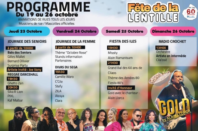 La Fête de la Lentille accueillera également un plateau artistique exceptionnel avec, en têtes d’affiches, l’artiste Alain Llorca du groupe mythique Gold, Alain Ramanisum, icône de l’île Maurice qu’on ne présente plus, les chanteurs antillais Jim Rama et Patrick Andrey ainsi que pleins d’autres artistes locaux tels que Kaf Malbar, T-Matt, Léa Churros, Sika R Lion, Pixl, Tidem, Mc Box, Clara, Missty, Mikl, PLL, Camille et bien d’autres talents réunionnais.