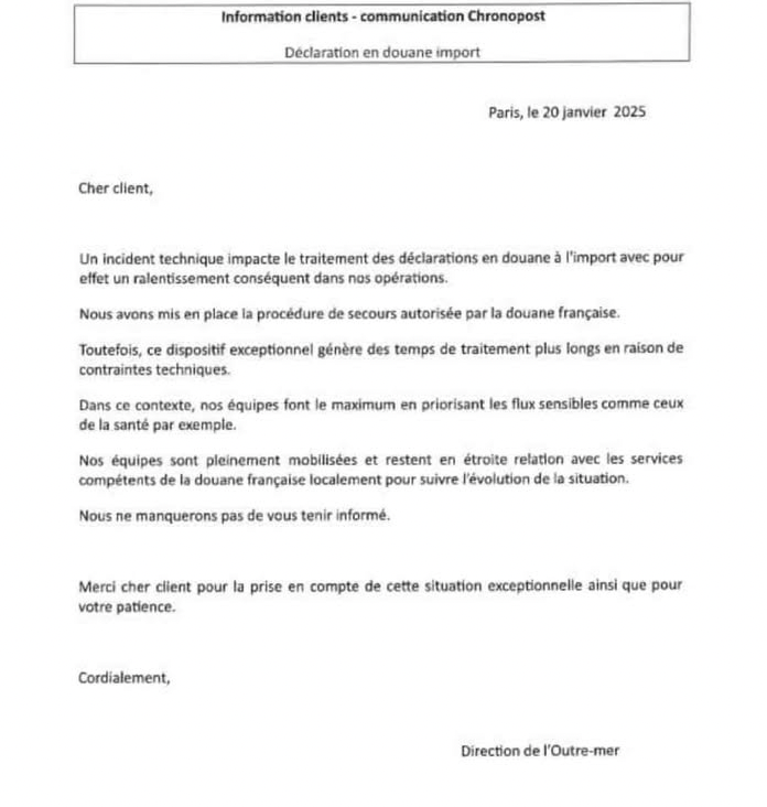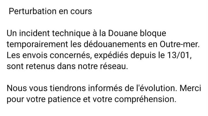 Un internaute a alerté Imaz Press sur les difficultés rencontrées pour récupérer son colis. Il explique avoir reçu un message de Colissimo où il est écrit : "un incident technique à la douane bloque temporairement les dédouanements en Outre-mer".
