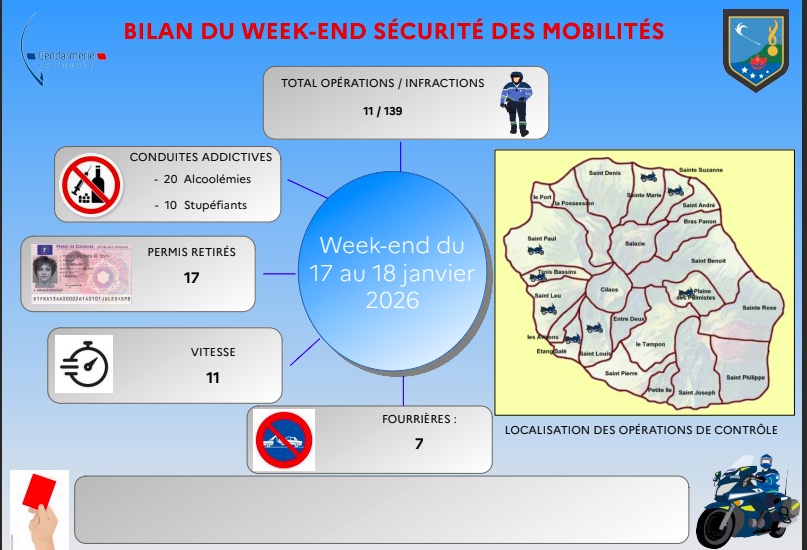 La Direction Territoriale de Police Nationale de La Réunion ont réalisé sur le département 20 opérations de sécurisation et de sécurité routière au cours de ce week-end du 16 au 19 janvier 2026 permettant de relever 77 infractions dont 24 délits :