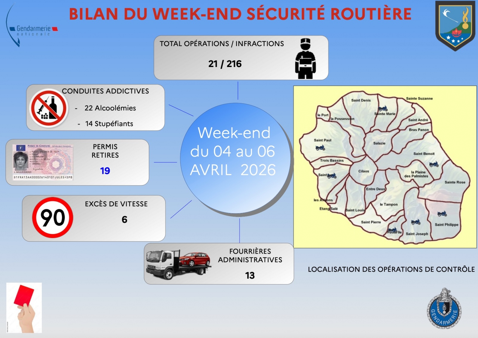 "Le 05 avril 2026, l’accompagnateur d’une jeune conductrice supervisée est contrôlé positif au THC à Petite-île. L’intéressé a fait l’objet d’une rétention immédiate de son permis de conduire et le véhicule a été placé en fourrière", détaille la gendarmerie.
