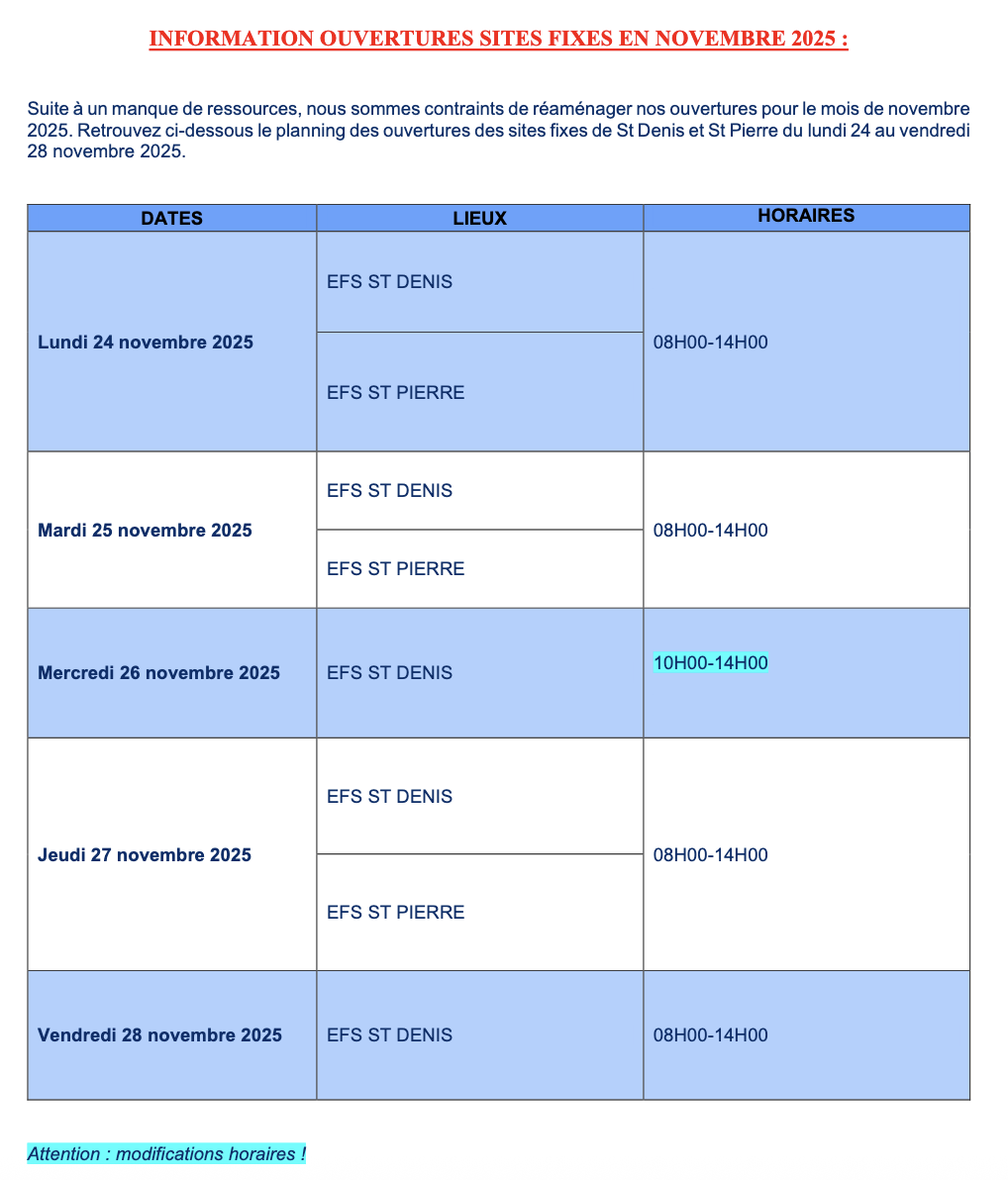 L'Établissement Français du Sang La Réunion- Océan Indien vous informe des collectes de sang organisées jusqu'au samedi 29 novembre 2025.
