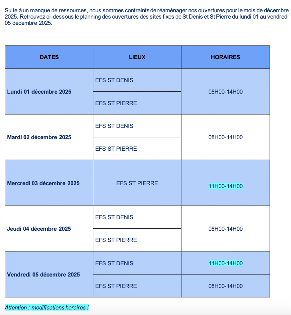 L’Établissement Français du Sang La Réunion- Océan Indien vous informe des collectes de sang organisées jusqu'au vendredi 05 décembre 2025 (Photo : www.imazpress.com)