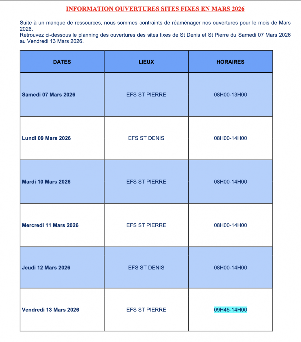 L’Établissement Français du Sang La Réunion- Océan Indien vous informe des collectes de sang organisées jusqu'au vendredi 13 Mars 2026 (Photo : Richard Bouhet/www.imazpress.com)