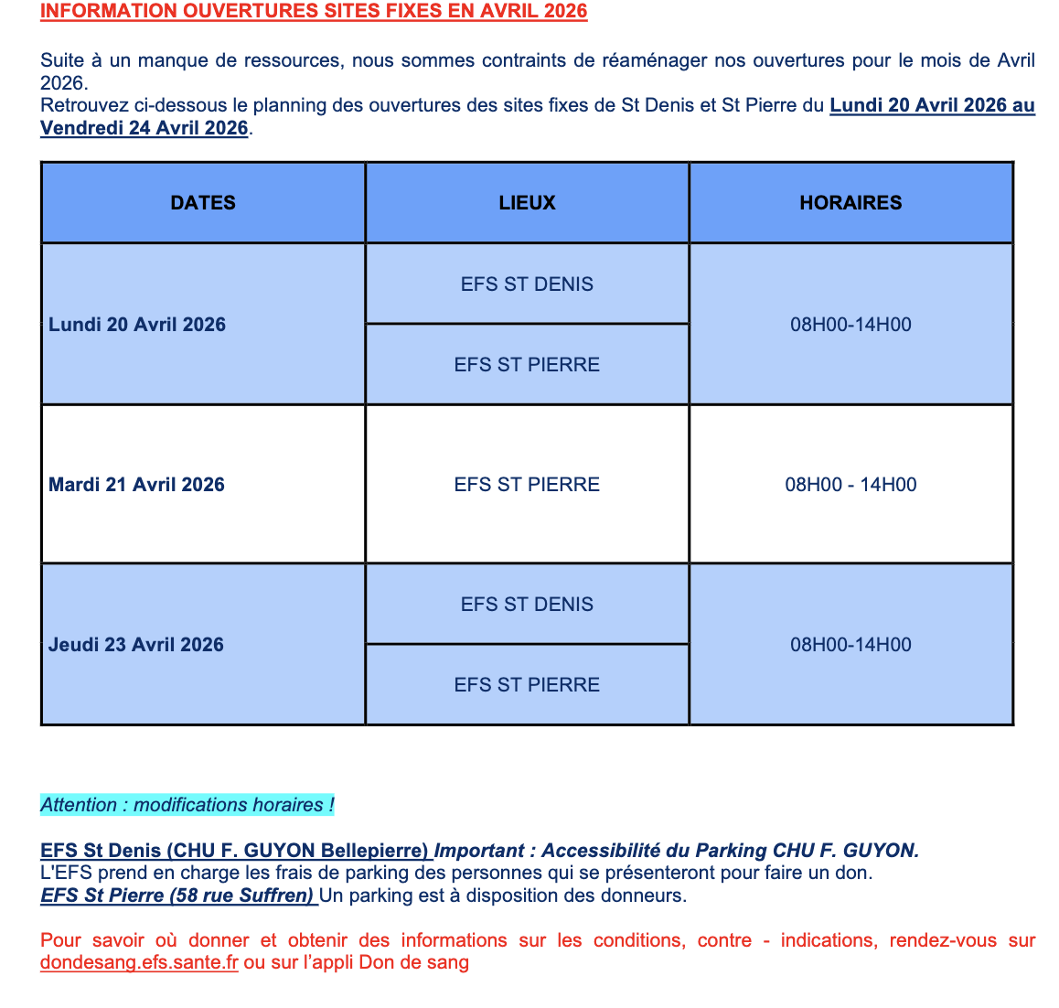 L'Établissement Français du Sang La Réunion-Océan Indien vous informe des collectes de sang organisées jusqu'au samedi 25 avril 2026 (Photo : Stephan Laï-Yu/www.imazpress.com)
