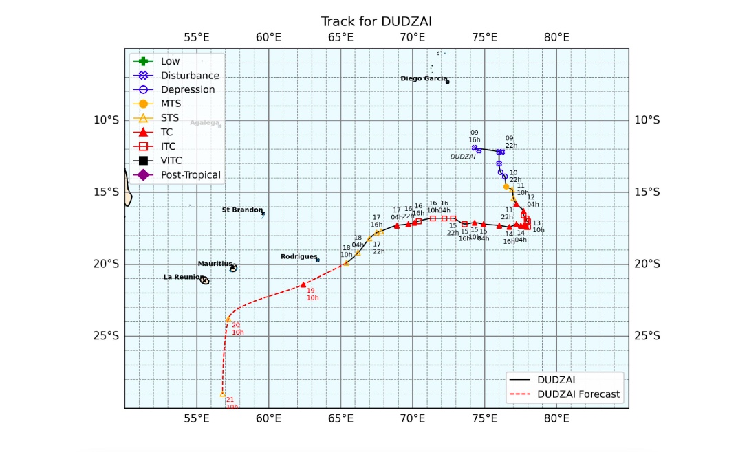 Elle se déplace dans une direction générale du sud-ouest à environ 15 km/h. Sur cette trajectoire, Dudzai continue de s'approcher dangereusement de Rodrigues et représente une menace potentielle pour l'île.