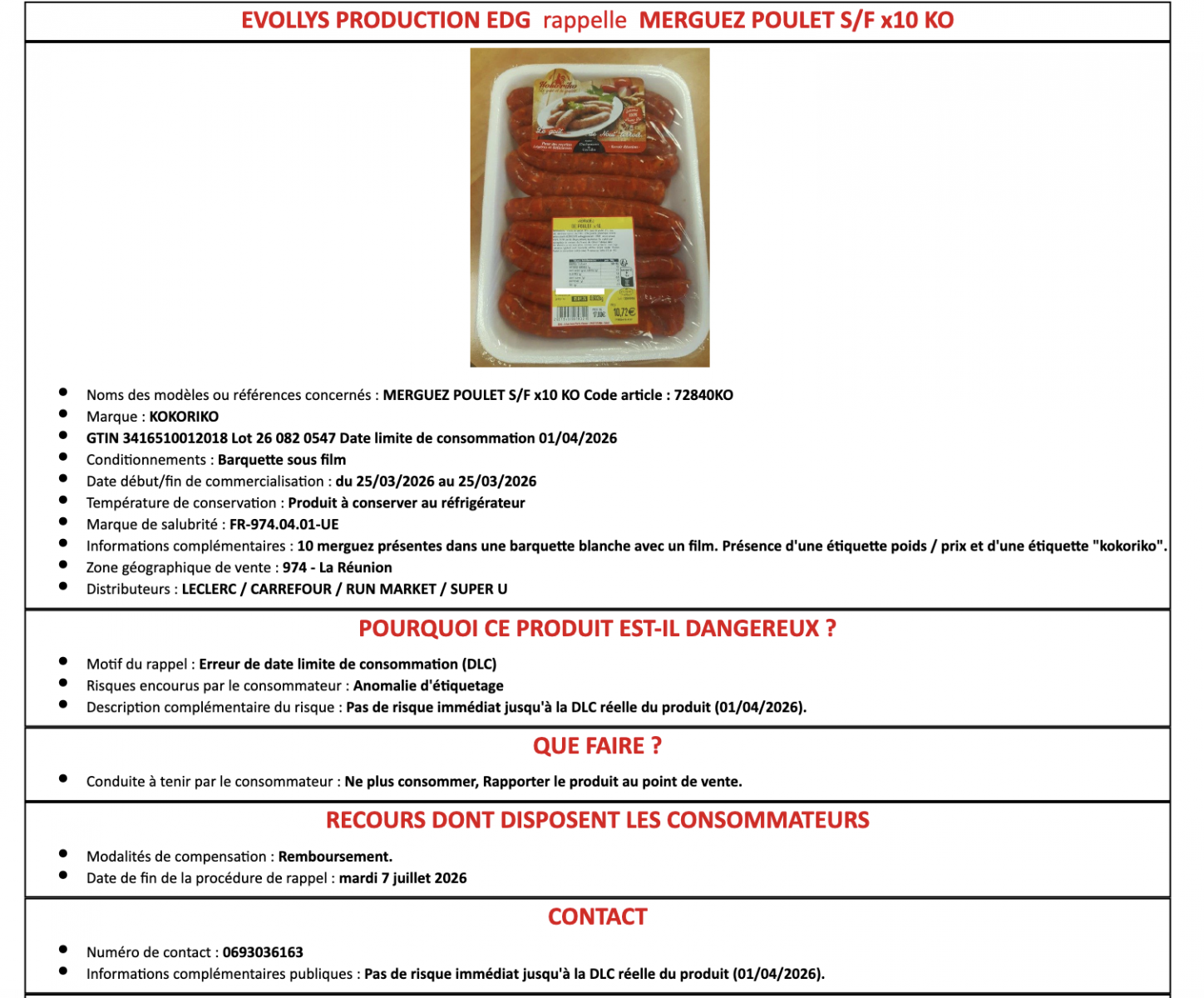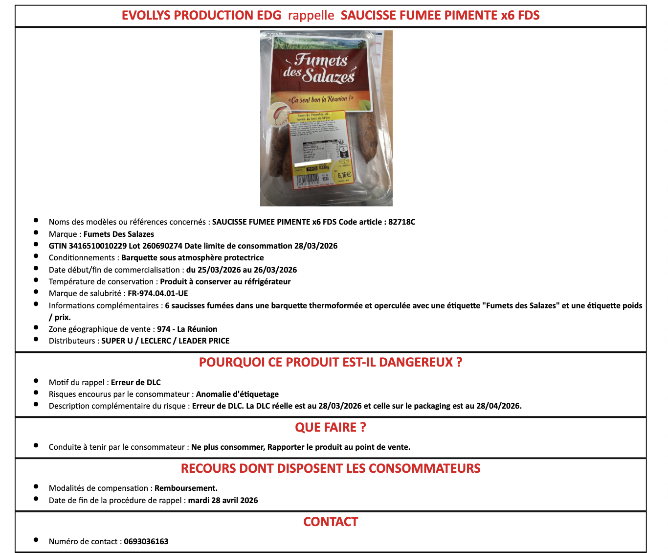 Ce produit a été commercialisé dans les Super U, Leclerc et Leader Price de La Réunion entre le 25 et le 26 mars 2027.