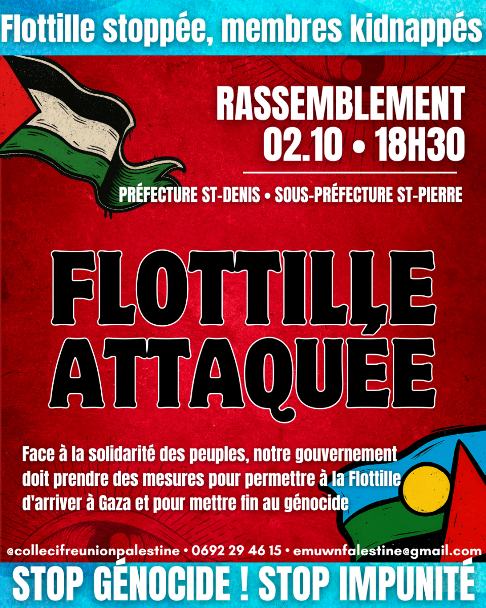 Les forces navales israéliennes ont intercepté mercredi 1er octobre 2025, la flottille qui s'approchait de la bande de Gaza, après que Israël a sommé les dizaines de bateaux de changer de cap. Suite à cette action, des élus et associations appellent à la mobilisation citoyenne à La Réunion et partout en France. Rendez-vous est donné ce jeudi 2 octobre 2025 à 18h30 devant la préfecture de Saint-Denis et la sous-préfecture de Saint-Pierre. Lancée à partir de l'Espagne début septembre, la Global Sumud Flotilla ("résilience" en arabe), se présente comme une "mission humanitaire". Elle compte 45 bateaux avec des centaines de militants propalestiniens originaires de plus de 40 pays.