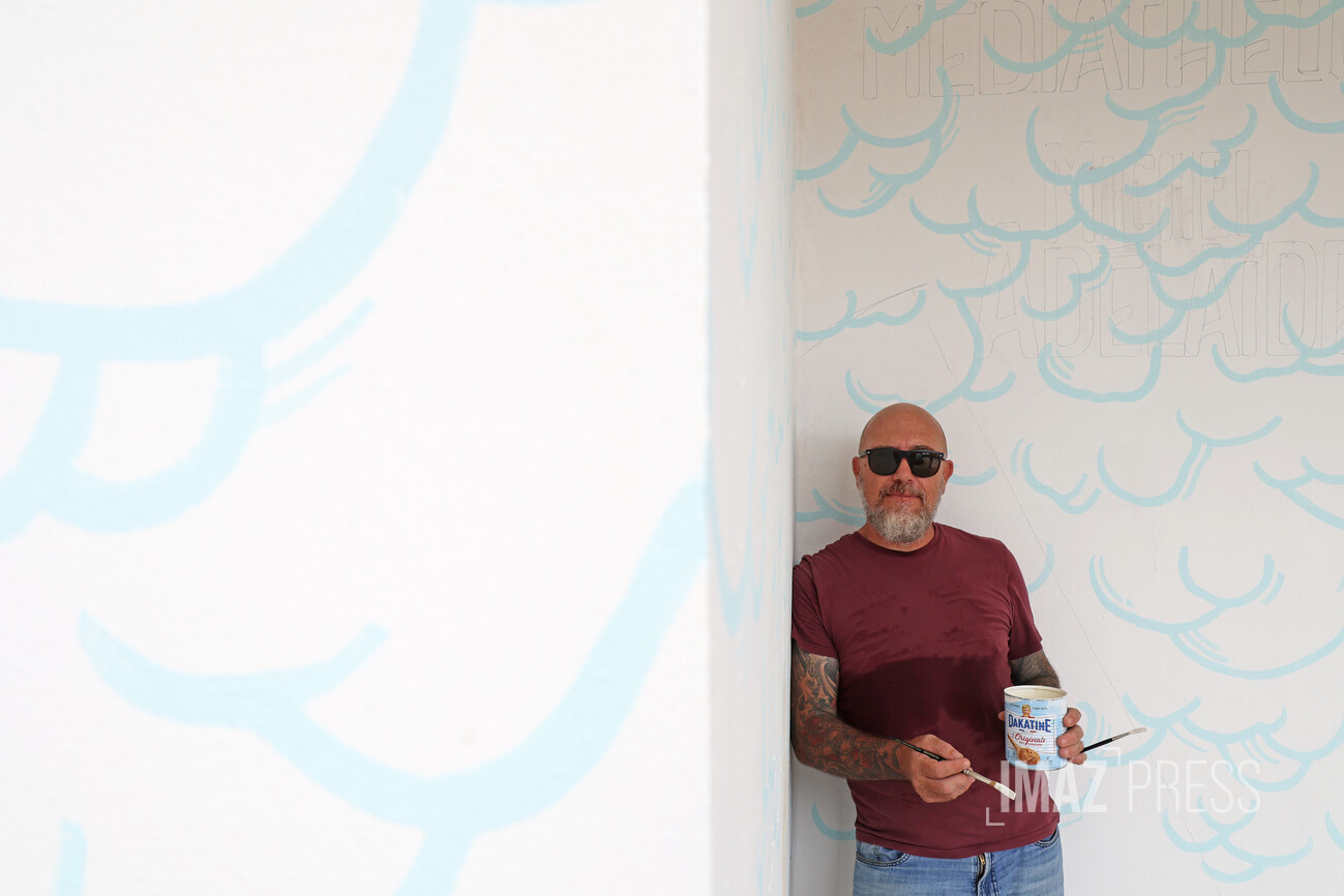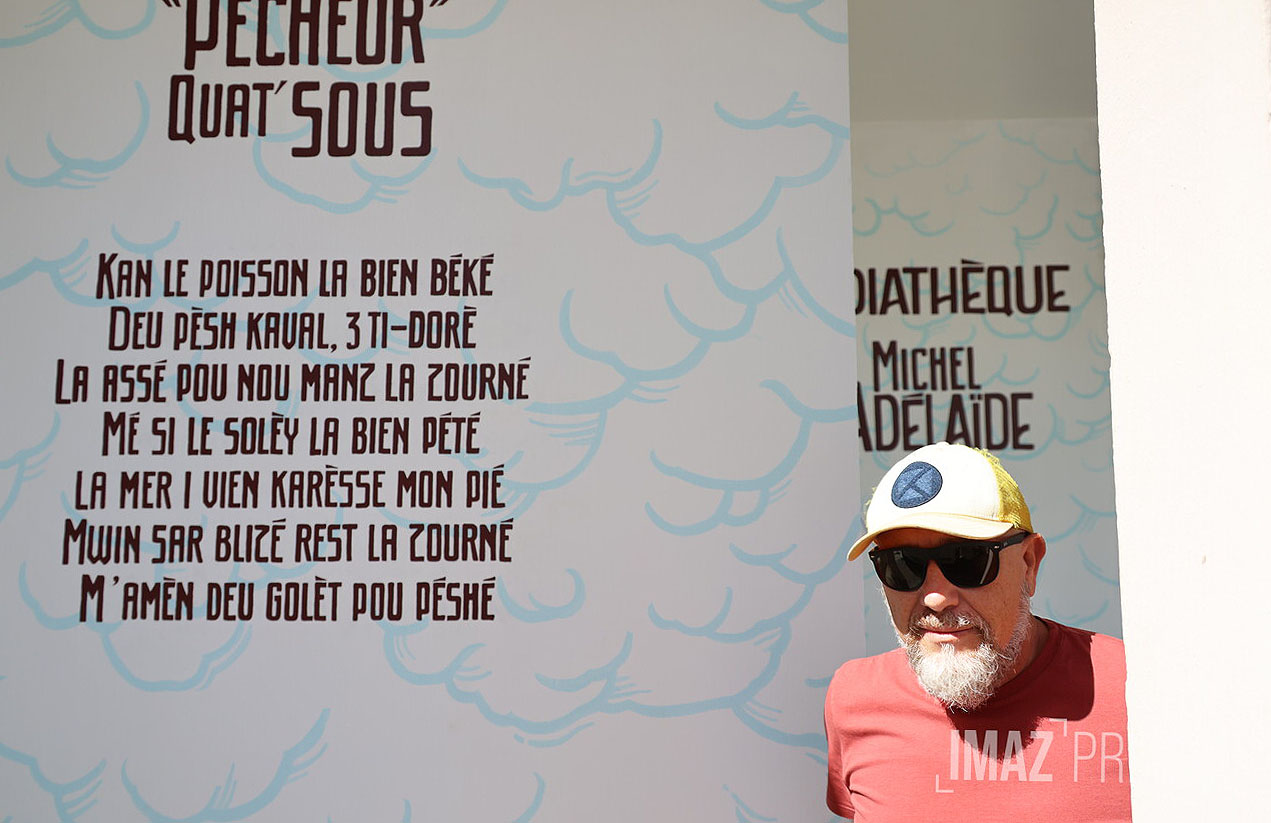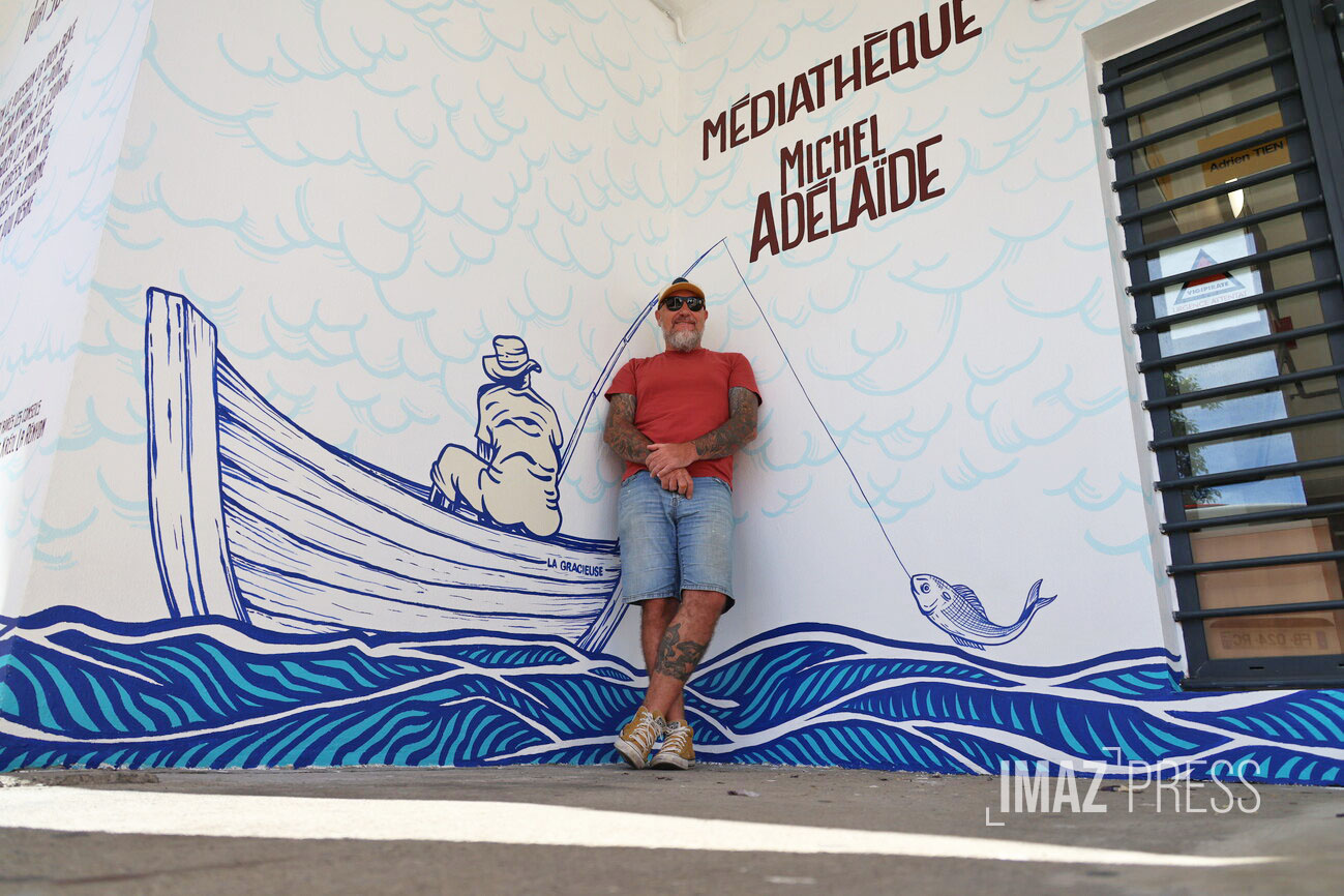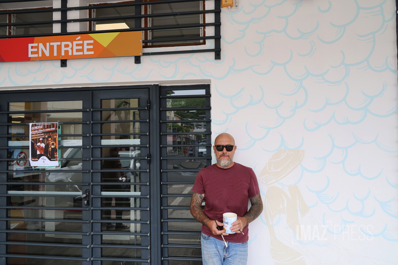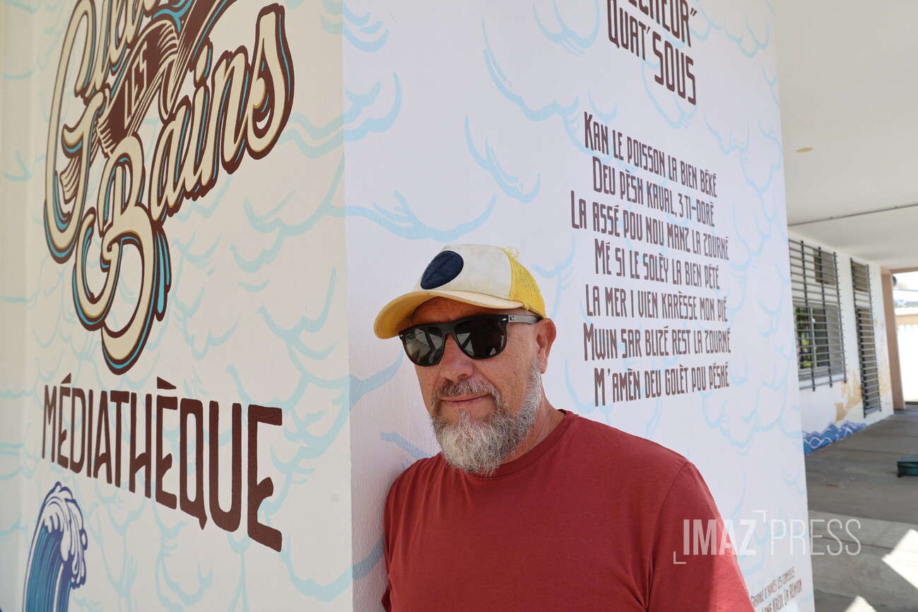 La médiathèque Michel-Adélaïde de Saint-Gilles-les-Bains se refait donc une beauté. Afin de la sublimer, une fresque de 15 mètres de long vient habiller les murs du bâtiment. Bruno André est peintre en lettres, un métier peu connu et qui a disparu avec l’arrivée de nouvelles techniques d’impression