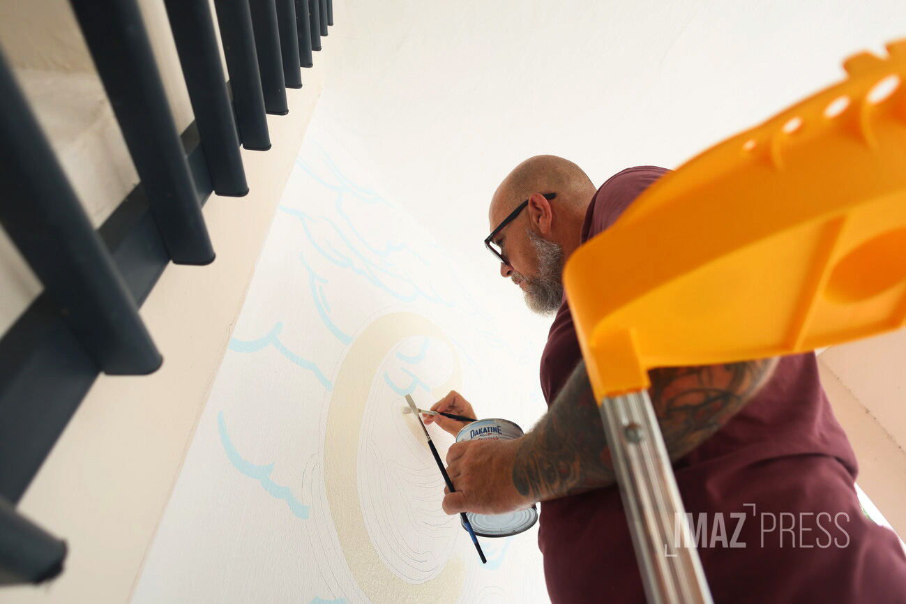 Sur les murs de la médiathèque de Saint-Gilles-les-Bains, Bruno André trace les lignes d’une nouvelle décoration. Des paroles de chansons de Michel Adélaïde, le portrait du chanteur, un champ de cannes, mais aussi des pêcheurs lontan. Après un appel à projets en décembre 2025, c’est un peintre en lettres qui a été choisi par la ville de Saint-Paul pour réaliser cette œuvre. (Photo :rb/www.imazpress.com)