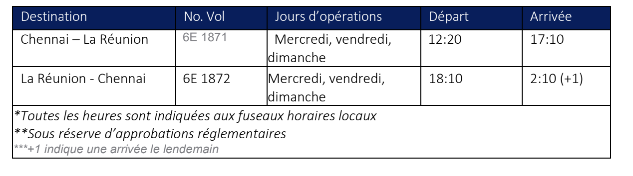 Programme des vols entre Chennai et La Réunion, à compter du 29 avril 2026