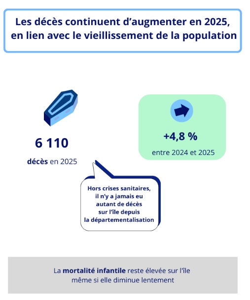 Le vieillissement de la population explique la hausse de la mortalité en 2025. La mortalité a été également plus élevée au mois d’avril, comparée aux cinq années précédentes, au moment du pic de l’épidémie de chikungunya.