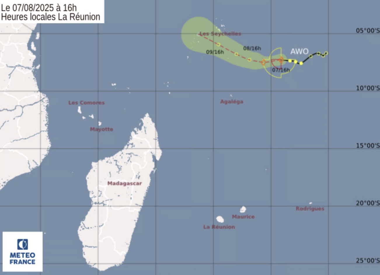 " Un affaiblissement du système est ensuite prévu à partir de vendredi, prenant une orientation ouest-nord-ouest en le dirigeant vers l'archipel des Seychelles au stade bien affaibli de dépression se comblant", détaille Météo France.