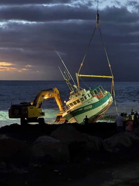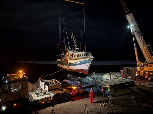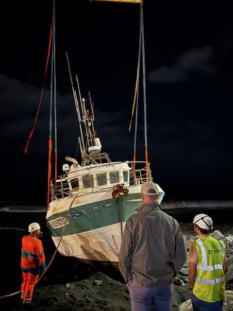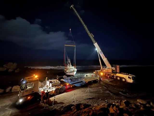 Le navire qui s'était échoué sur le sable de la Pointe des Galets à proximité du port-ouest au Port dans la nuit du la nuit du lundi 4 au mardi 5 août 2025 "a été déséchoué, levé et transporté par la route jusqu’au port-ouest, où il a pu être mis en sécurité aux alentours de minuit" informe ce mercredi l’armement à la pêche Enez a qui appartient l'embarcation. Nous publions ci-dessous le communiqué de l'armateur (Photo Armement Réunimer)